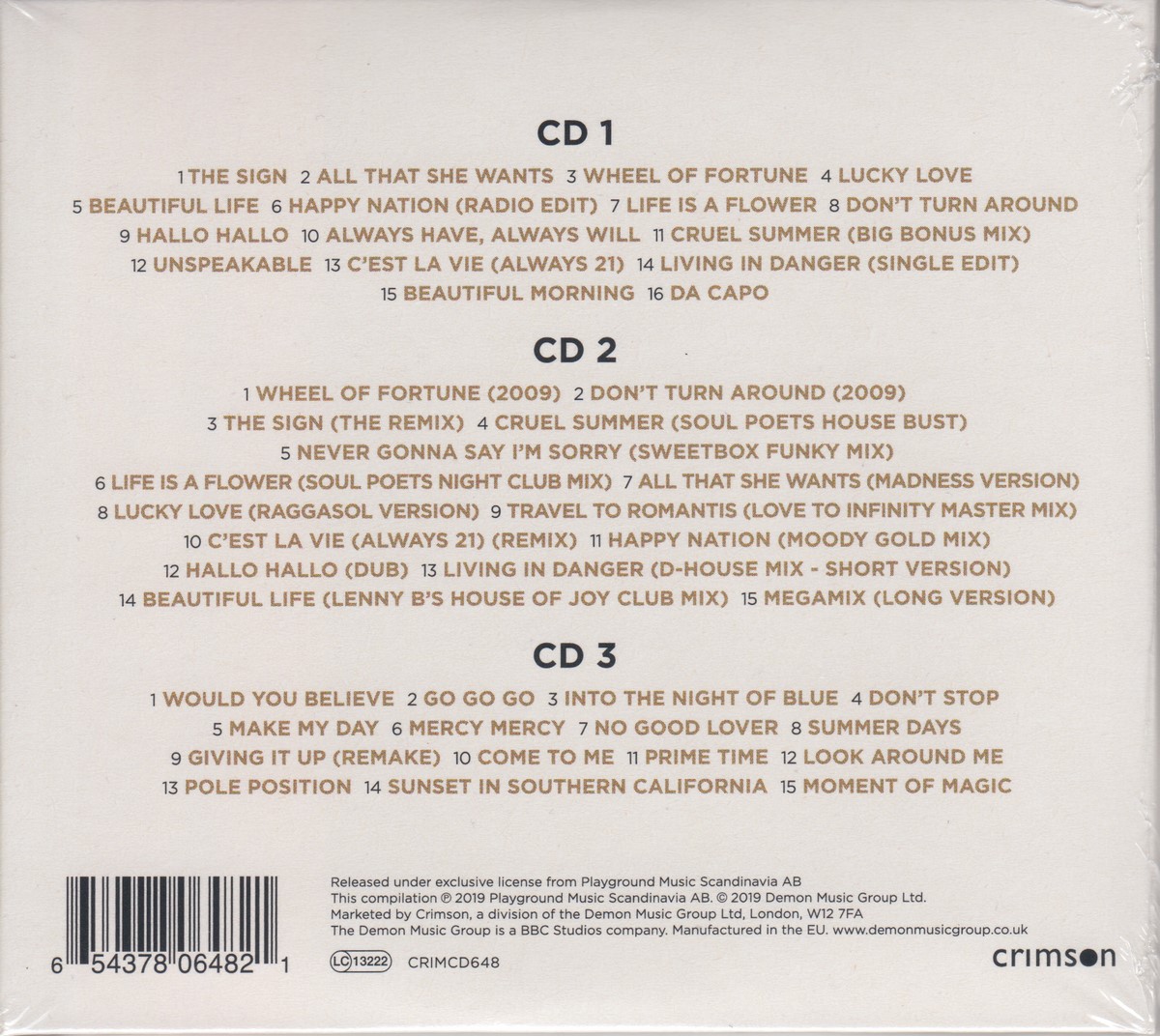 Country of release: UK Release Year: 2019 Edition: – Features: – Notes: – Tracklist: Disc 1/3 Greatest Hits: 1-1 The Sign 1-2 All That She Wants 1-3 Wheel Of Fortune 1-4 Lucky Love 1-5 Beautiful Life 1-6 Happy Nation (Radio Edit) 1-7 Life Is A Flower 1-8 Don't Turn Around 1-9 Hallo Hallo 1-10 Always Have, Always Will 1-11 Cruel Summer (Big Bonus Mix) 1-12 Unspeakable 1-13 C'Est La Vie (Always 21) 1-14 Living In Danger (Single Edit) 1-15 Beautiful Morning 1-16 Da Capo Disc 2/3 Classic Remixes: 2-1 Wheel Of Fortune (2009) 2-2 Don't Turn Around (2009) 2-3 The Sign (The Remix) 2-4 Cruel Summer (Soul Poets House Bust) 2-5 Never Gonna Say I'm Sorry (Sweetbox Funky Mix) 2-6 Life Is A Flower (Soul Poets Night Club Mix) 2-7 All That She Wants (Madness Version) 2-8 Lucky Love (Raggasol Version) 2-9 Travel To Romantis (Love To Infinity Master Mix) 2-10 C'Est La Vie (Always 21) (Remix) 2-11 Happy Nation (Moody Gold Mix) 2-12 Hallo Hallo (Dub) 2-13 Living In Danger (D-House Mix - Short Version) 2-14 Beautiful Life (Lenny B's House Of Joy Club Mix) 2-15 Megamix (Long Version) Disc 3/3 Hidden Gems: 3-1 Would You Believe 3-2 Go Go Go 3-3 Into The Night Of Blue 3-4 Don't Stop 3-5 Make My Day 3-6 Mercy Mercy 3-7 No Good Lover 3-8 Summer Days 3-9 Giving It Up (Remake) 3-10 Come To Me 3-11 Prime Time 3-12 Look Around Me 3-13 Pole Position 3-14 Sunset In Southern California 3-15 Moment Of Magic More pictures, click to view full size: