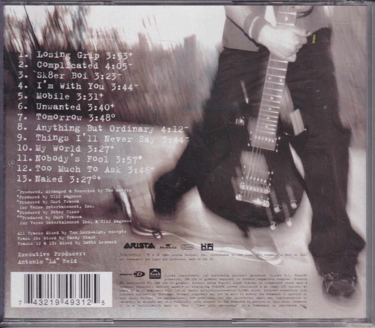 Country of release: Europe Release Year: 2002 Edition: – Features: Enhanced CD Notes: – Tracklist: 1 Losing Grip 3:53 2 Complicated 4:05 3 Sk8er Boi 3:23 4 I'm With You 3:44 5 Mobile 3:31 6 Unwanted 3:40 7 Tomorrow 3:48 8 Anything But Ordinary 4:12 9 Things I'll Never Say 3:44 10 My World 3:27 11 Nobody's Fool 3:57 12 Too Much To Ask 3:46 13 Naked 3:27 Video Complicated More pictures, click to view full size: