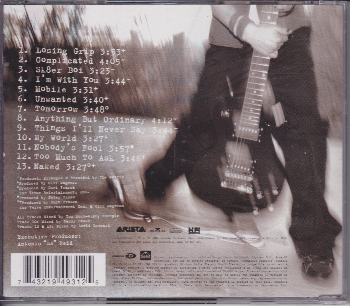 Country of release: Europe Release Year: 2002 Edition: – Features: Enhanced CD Notes: – Tracklist: 1 Losing Grip 3:53 2 Complicated 4:05 3 Sk8er Boi 3:23 4 I'm With You 3:44 5 Mobile 3:31 6 Unwanted 3:40 7 Tomorrow 3:48 8 Anything But Ordinary 4:12 9 Things I'll Never Say 3:44 10 My World 3:27 11 Nobody's Fool 3:57 12 Too Much To Ask 3:46 13 Naked 3:27 Video Complicated More pictures, click to view full size: