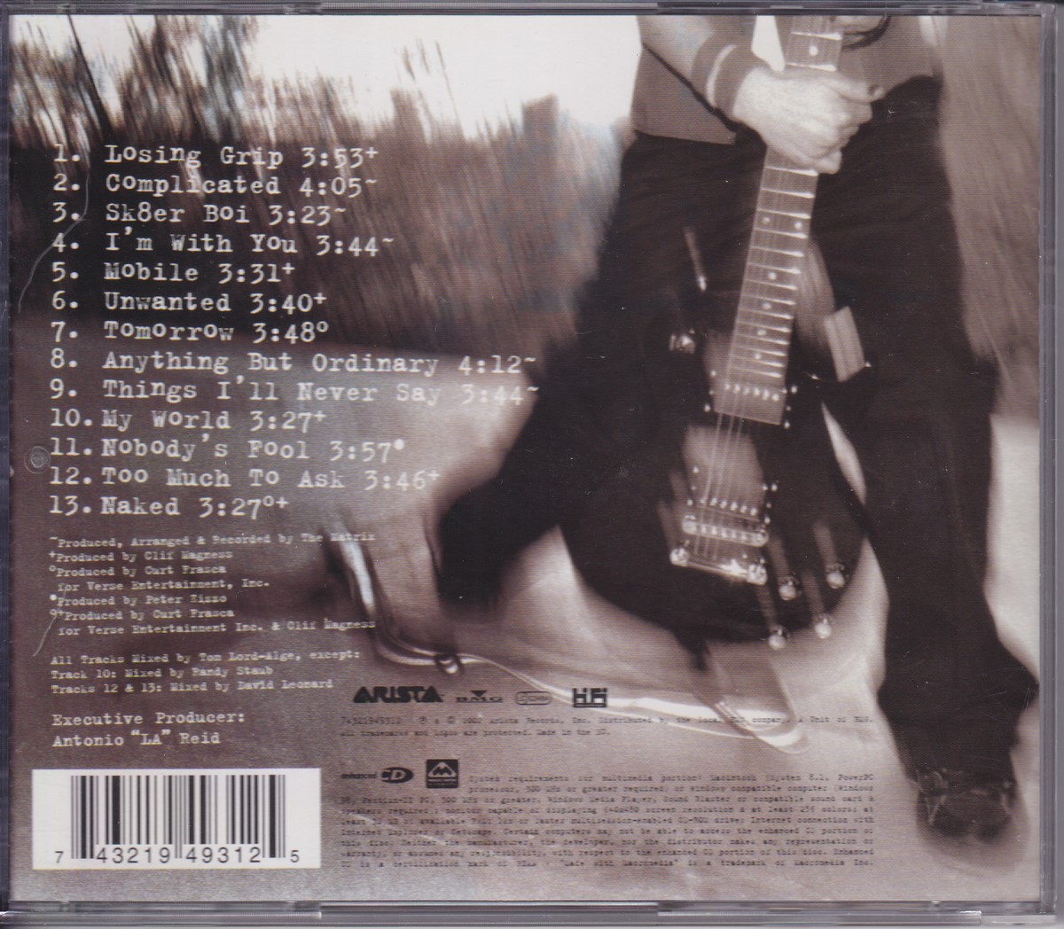 Country of release: Europe Release Year: 2002 Edition: – Features: Enhanced CD Notes: – Tracklist: 1 Losing Grip 3:53 2 Complicated 4:05 3 Sk8er Boi 3:23 4 I'm With You 3:44 5 Mobile 3:31 6 Unwanted 3:40 7 Tomorrow 3:48 8 Anything But Ordinary 4:12 9 Things I'll Never Say 3:44 10 My World 3:27 11 Nobody's Fool 3:57 12 Too Much To Ask 3:46 13 Naked 3:27 Video Complicated More pictures, click to view full size: