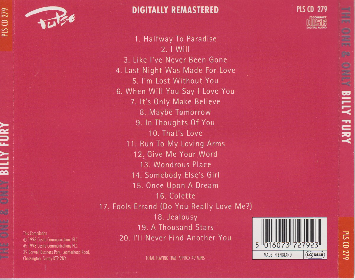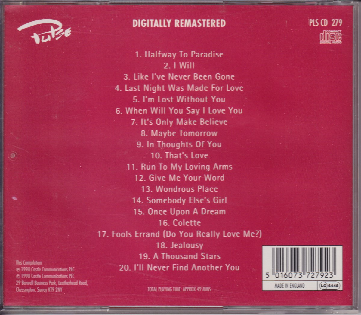 Country of release: UK Release Year: 1998 Edition: Remastered Features: Remastered Notes: – Tracklist: 1 Halfway To Paradise 2 I Will 3 Like I've Never Been Gone 4 Last Night Was Made For Love 5 I'm Lost Without You 6 When Will You Say I Love You 7 It's Only Make Believe 8 Maybe Tomorrow 9 In Thoughts Of You 10 That's Love 11 Run To My Loving Arms 12 Give Me Your Word 13 Wondrous Place 14 Somebody Else's Girl 15 Once Upon A Dream 16 Colette 17 Fools Errand (Do You Really Love Me?) 18 Jealousy 19 A Thousand Stars 20 I'll Never Find Another You More pictures, click to view full size: