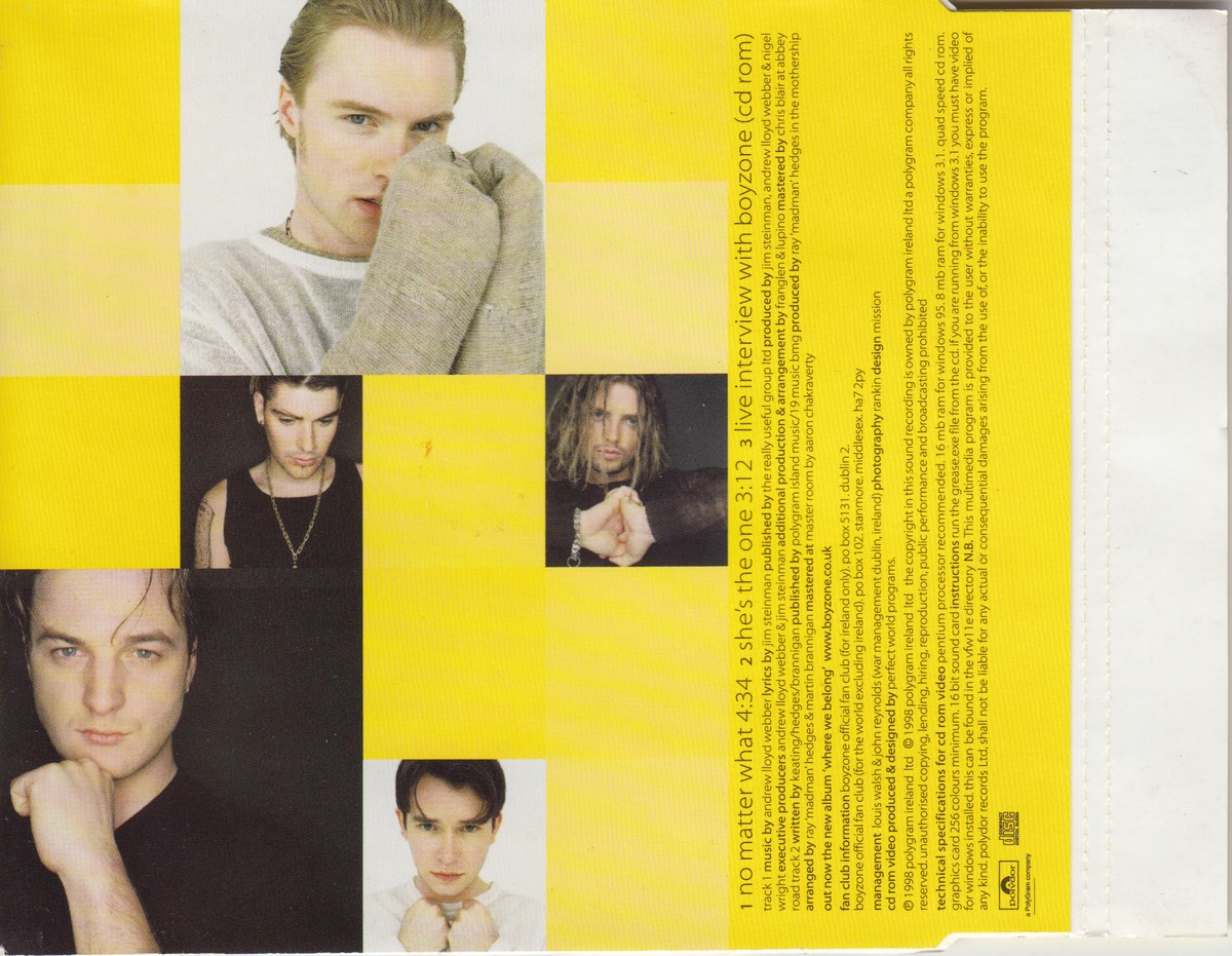 Country of release: UK & Europe Release Year: 1998 Edition: – Features: Enhanced CD Notes: – Tracklist: 1 No Matter What 4:34 2 She's The One 3:12 Video Live Interview With Boyzone More pictures, click to view full size: