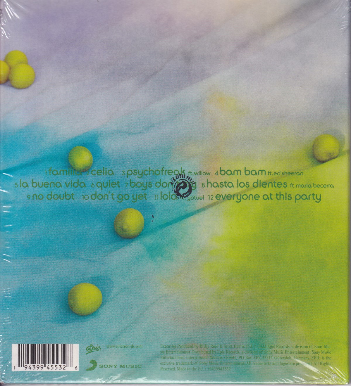 Country of release: Europe Release Year: 2022 Edition: Deluxe Edition Features: – Notes: Oversized CD tri-fold softpak includes exclusive poster and photo cards. Tracklist: 1 Familia 0:17 2 Celia 2:33 3 Psychofreak 3:21 4 Bam Bam 3:26 5 La Buena Vida 3:17 6 Quiet 2:43 7 Boyd Don't Cry 3:42 8 Hasta Los Dientes 3:08 9 No Doubt 3:10 10 Don't Go Yet 2:44 11 Lola 3:05 12 Everyone At This Party 2:48 More pictures, click to view full size: