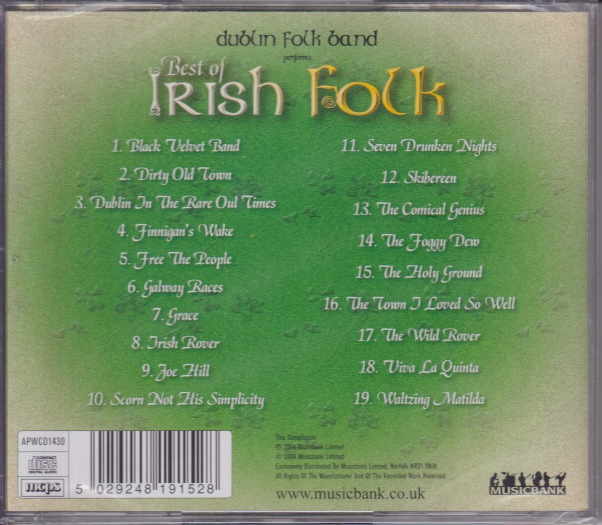 Country of release: UK Release Year: 2004 Edition: – Features: Compilation Notes: – Tracklist: 1 Black Velvet Band 2 Dirty Old Town 3 Dublin In The Rare Oul Times 4 Finnigan's Wake 5 Free The People 6 Galway Races 7 Grace 8 Irish Rover 9 Joe Hill 10 Scorn Not His Simplicity 11 Seven Drunken Nights 12 Skibereen 13 The Comical Genius 14 The Foggy Dew 15 The Holy Ground 16 The Town I Loved So Well 17 The Wild Rover 18 Viva la Quinta 19 Waltzing Matilda More pictures, click to view full size: