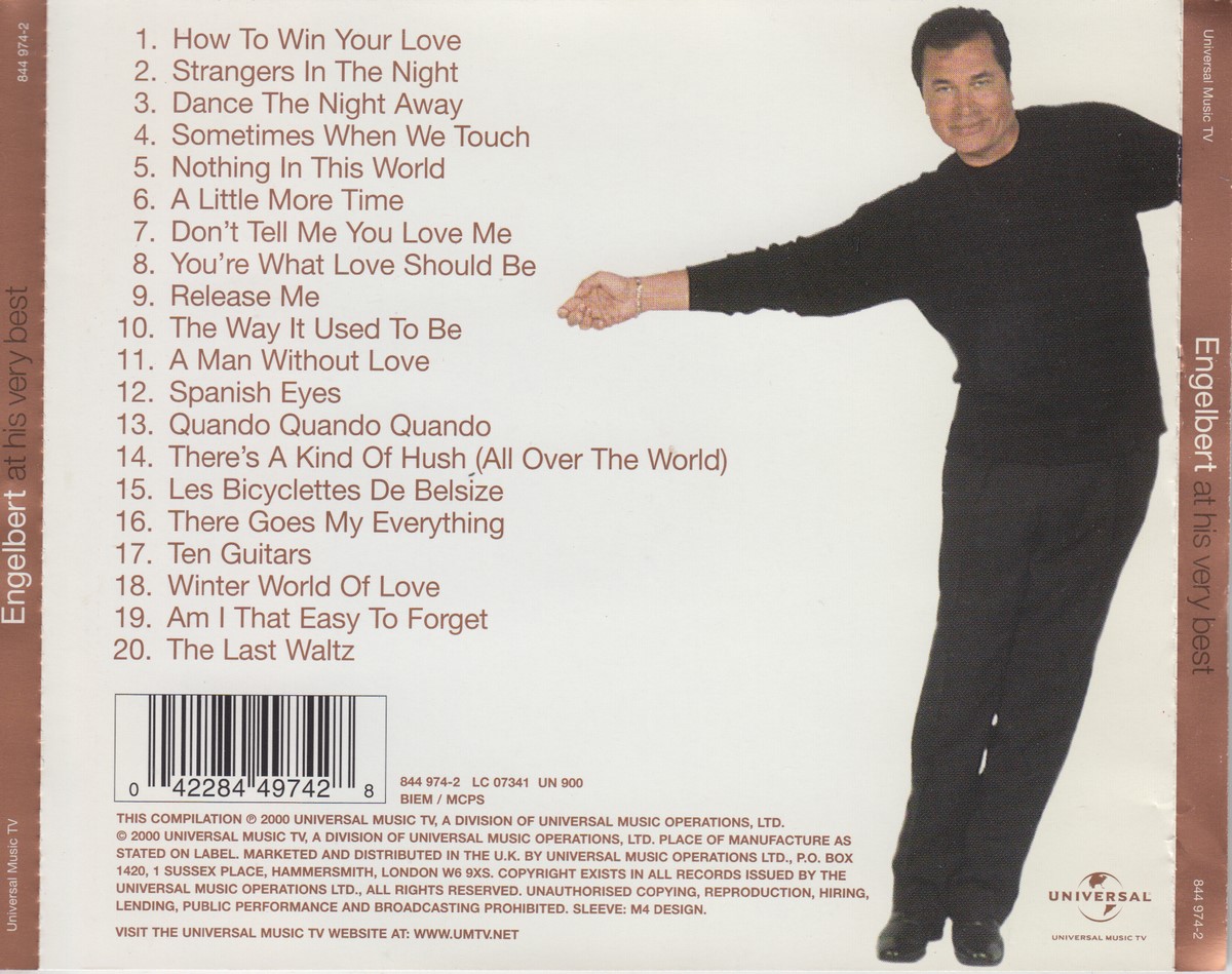 Country of release: UK Release Year: 2000 Edition: – Features: Compilation Notes: – Tracklist: 1 How To Win Your Love 2 Strangers In The Night 3 Dance The Night Away 4 Sometimes When We Touch 5 Nothing In This World 6 A Little More Time 7 Don't Tell Me You Love Me 8 You're What Love Should Be 9 Release Me 10 The Way It Used To Be 11 A Man Without Love 12 Spanish Eyes 13 Quando Quando Quando 14 There's A Kind Of Hush (All Over The World) 15 Les Bicyclettes De Belsize 16 There Goes My Everything 17 Ten Guitars 18 Winter World Of Love 19 Am I That Easy To Forget 20 The Last Waltz More pictures, click to view full size: