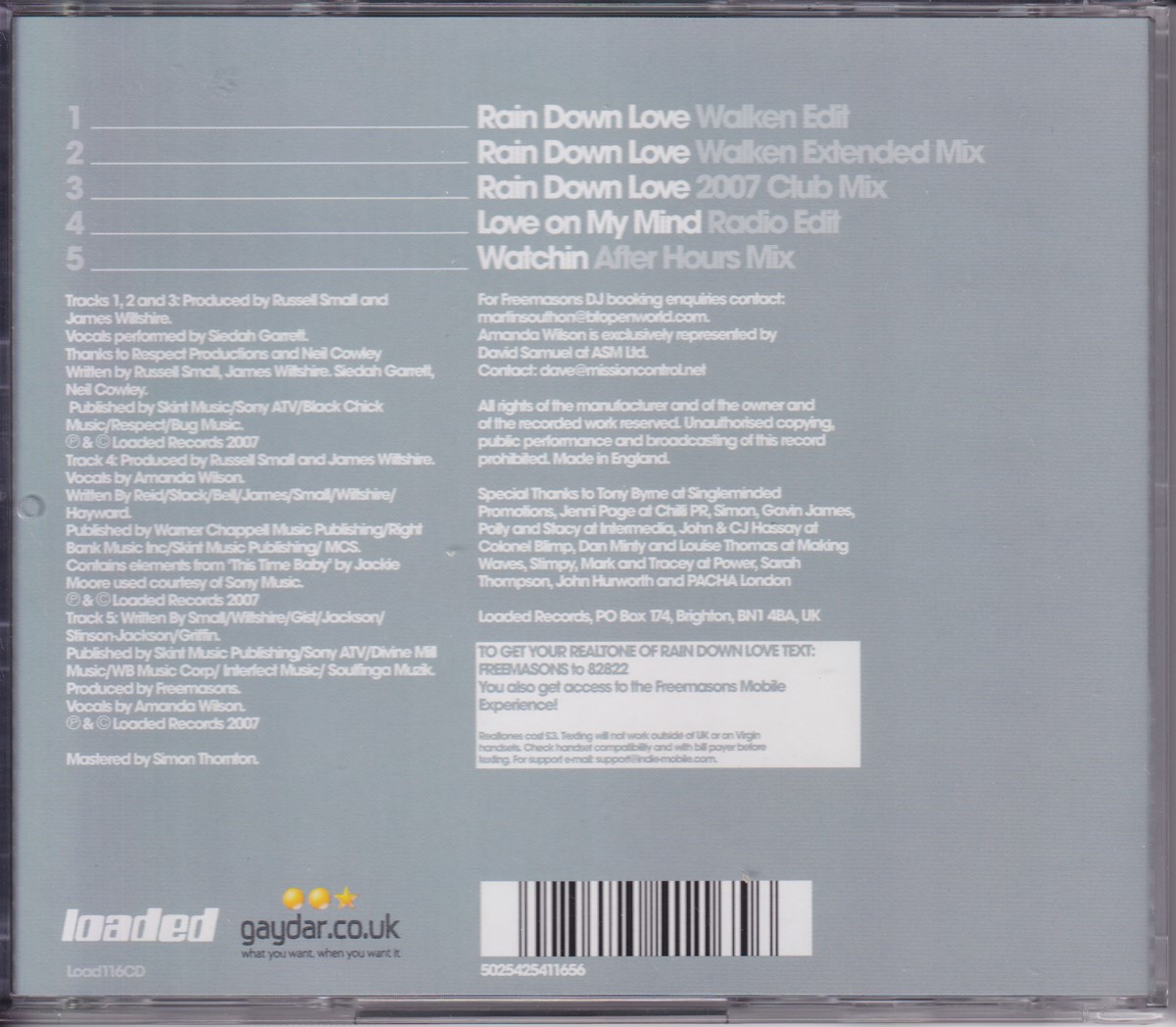 Country of release: UK Release Year: 2007 Edition: – Features: – Notes: – Tracklist: 1 Rain Down Love (Walken Edit) 3:17 • Remix – Walken (2) 2 Rain Down Love (Walken Extended Mix) 5:57 • Remix – Walken (2) 3 Rain Down Love (2007 Club Mix) 7:01 4 Love On My Mind (Radio Edit) 3:03 5 Watchin' (After Hours Mix) 5:36 More pictures, click to view full size: