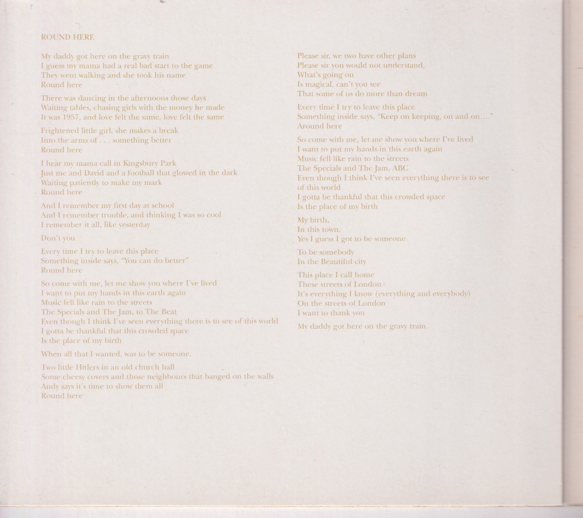 Country of release: UK Release Year: 2004 Edition: – Features: Digipak, Enhanced CD Notes: – Tracklist: 1 Round Here 5:54 2 Patience 2:53 Video Round Here More pictures, click to view full size: