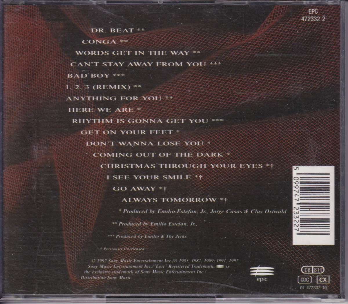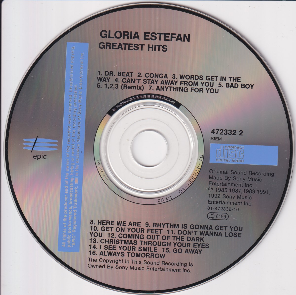 Country of release: Europe Release Year: 1992 Edition: – Features: Compilation Notes: – Tracklist: 1 Dr. Beat 2 Conga 3 Words Get In The Way 4 Can't Stay Away From You 5 Bad Boy (Remix) 6 1, 2, 3 (Remix) 7 Anything For You 8 Here We Are 9 Rhythm Is Gonna Get You 10 Get On Your Feet 11 Don't Wanna Lose You 12 Coming Out Of The Dark 13 Christmas Through Your Eyes 14 I See Your Smile 15 Go Away 16 Always Tomorrow More pictures, click to view full size: