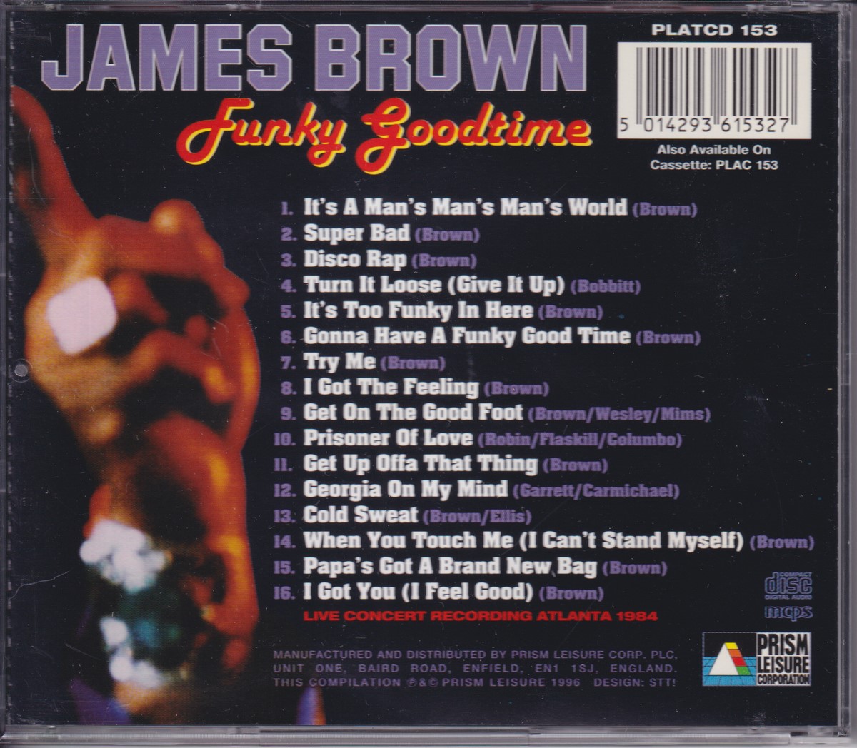 Country of release: UK Release Year: 1996 Edition: – Features: Compilation Notes: – Tracklist: 1 It's A Man's Man's Man's World 2 Super Bad 3 Disco Rap 4 Turn It Loose (Give It Up) 5 It's Too Funky In Here 6 Gonna Have A Funky Good Time 7 Try Me 8 I Got The Feeling 9 Get On The The Good Foot 10 Prisoner Of Love 11 Get Up Offa That Thing 12 Georgia On My Mind 13 Cold Sweat 14 When You Touch Me (I Can't Stand Myself) 15 Papa's Got A Brand New Bag 16 I Got You (I Feel Good) More pictures, click to view full size:
