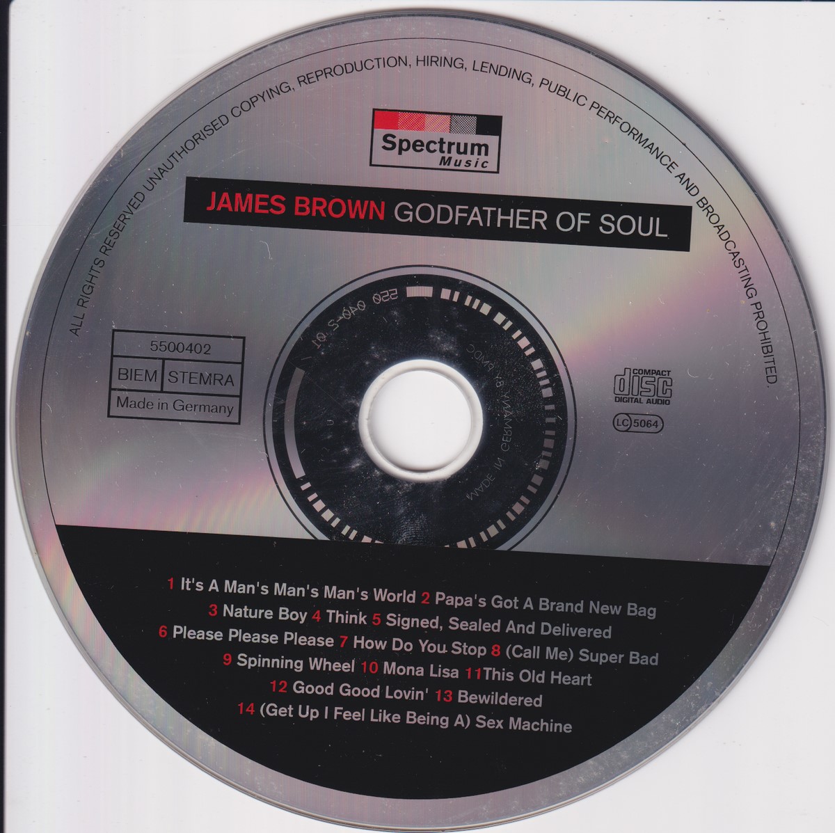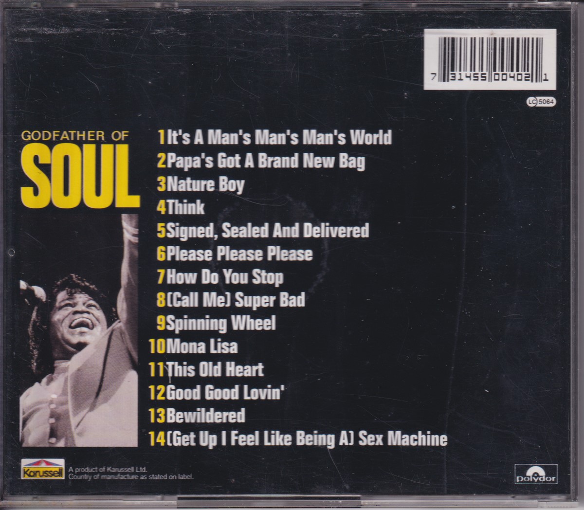 Country of release: Europe Release Year: 1993 Edition: – Features: Compilation Notes: – Tracklist: 1 It's A Man's Man's Man's World 2:48 2 Papa's Got A Brand New Bag 2:07 3 Nature Boy 2:44 4 Think 2:48 5 Signed, Sealed And Delivered 2:44 6 Please Please Please 2:46 7 How Do You Stop 5:26 8 (Call Me) Super Bad 4:16 9 Spinning Wheel 2:28 10 Mona Lisa 1:59 11 This Old Heart 2:12 12 Good Good Lovin' 2:16 13 Bewildered 2:26 14 (Get Up I Feel Like Being A) Sex Machine 5:15 More pictures, click to view full size:
