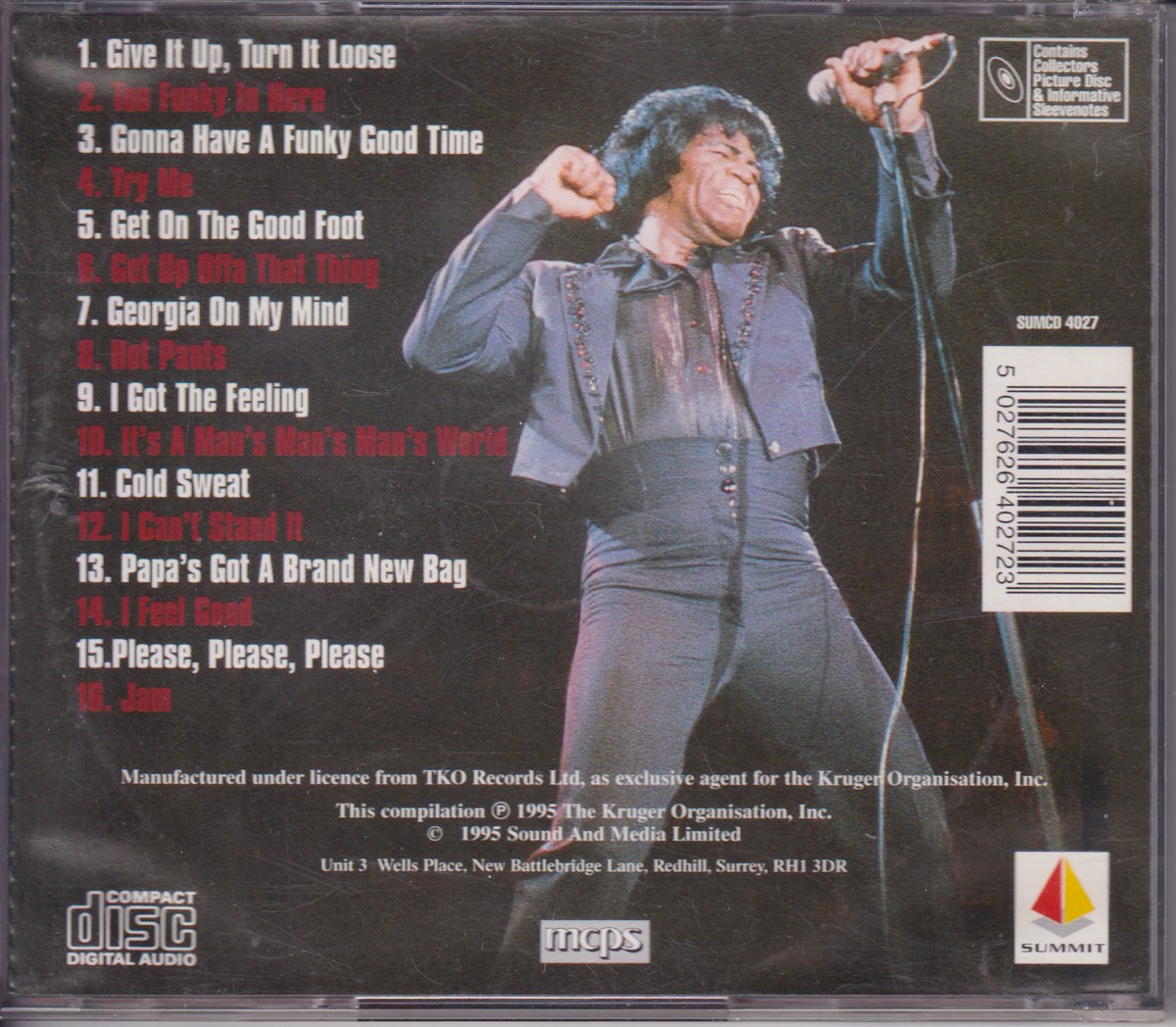 Country of release: UK Release Year: 1995 Edition: Reissue Features: – Notes: – Tracklist: 1 Give It Up, Turn It Lose 2 Too Funky In Here 3 Gonna Have A Funky Good Time 4 Try Me 5 Get On The Good Foot 6 Get Up Offa That Thing 7 Georgia On My Mind 8 Hot Pants 9 I Got The Feeling 10 It's A Man's Man's Man's World 11 Cold Sweat 12 I Can't Stand It 13 Papa's Got A Brand New Bag 14 I Feel Good 15 Please, Please, Please 16 Jam More pictures, click to view full size: