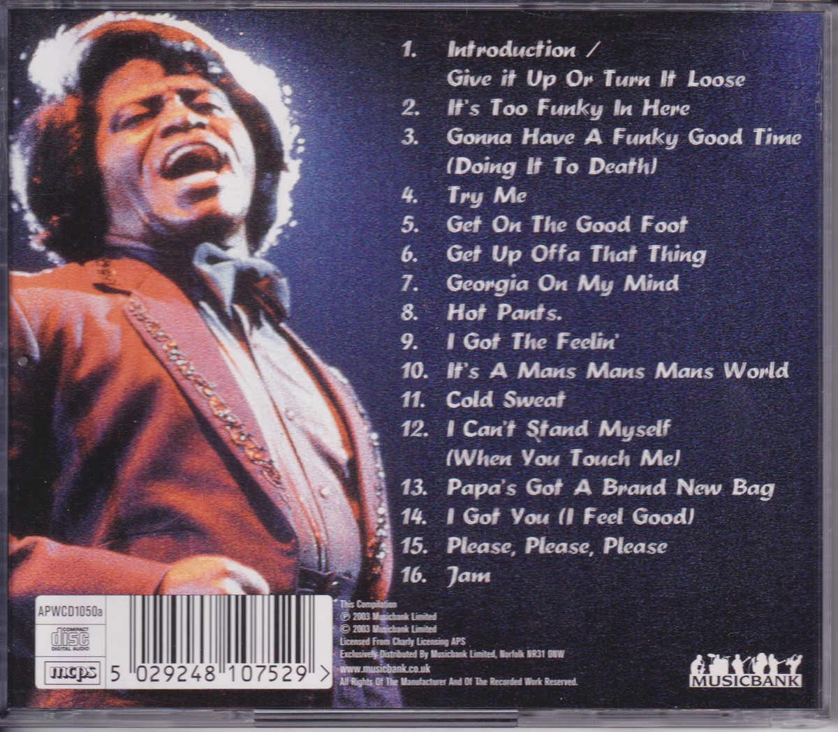 Country of release: UK & Europe Release Year: 2003 Edition: – Features: – Notes: – Tracklist: 1 Introduction / Give It Up Or Turn It Loose 2:04 2 It's Too Funky In Here 5:05 3 Gonna Have A Funky Good Time (Doing It To Death) 4:02 4 Try Me 5:31 5 Get On The Good Foot 3:08 6 Get Up Offa That Thing 2:17 7 Georgia On My Mind 5:53 8 Hot Pants 1:17 9 I Got The Feelin' 2:21 10 It's A Man's Man's Man's World 9:12 11 Cold Sweat 2:07 12 I Can't Stand Myself (When You Touch Me) 1:00 13 Papa's Got A Brand New Bag 2:16 14 I Got You (I Feel Good) 3:31 15 Please, PLease, Please 3:47 16 Jam 4:55 More pictures, click to view full size: