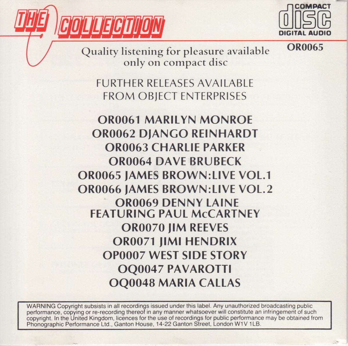 Format: CD Freetext: – Type: Album Number in Set: 1 Case Type: Standard jewel case Label & Cat.no.: Object Enterprises – OR0065 The Collection (6) – OR0065 |
