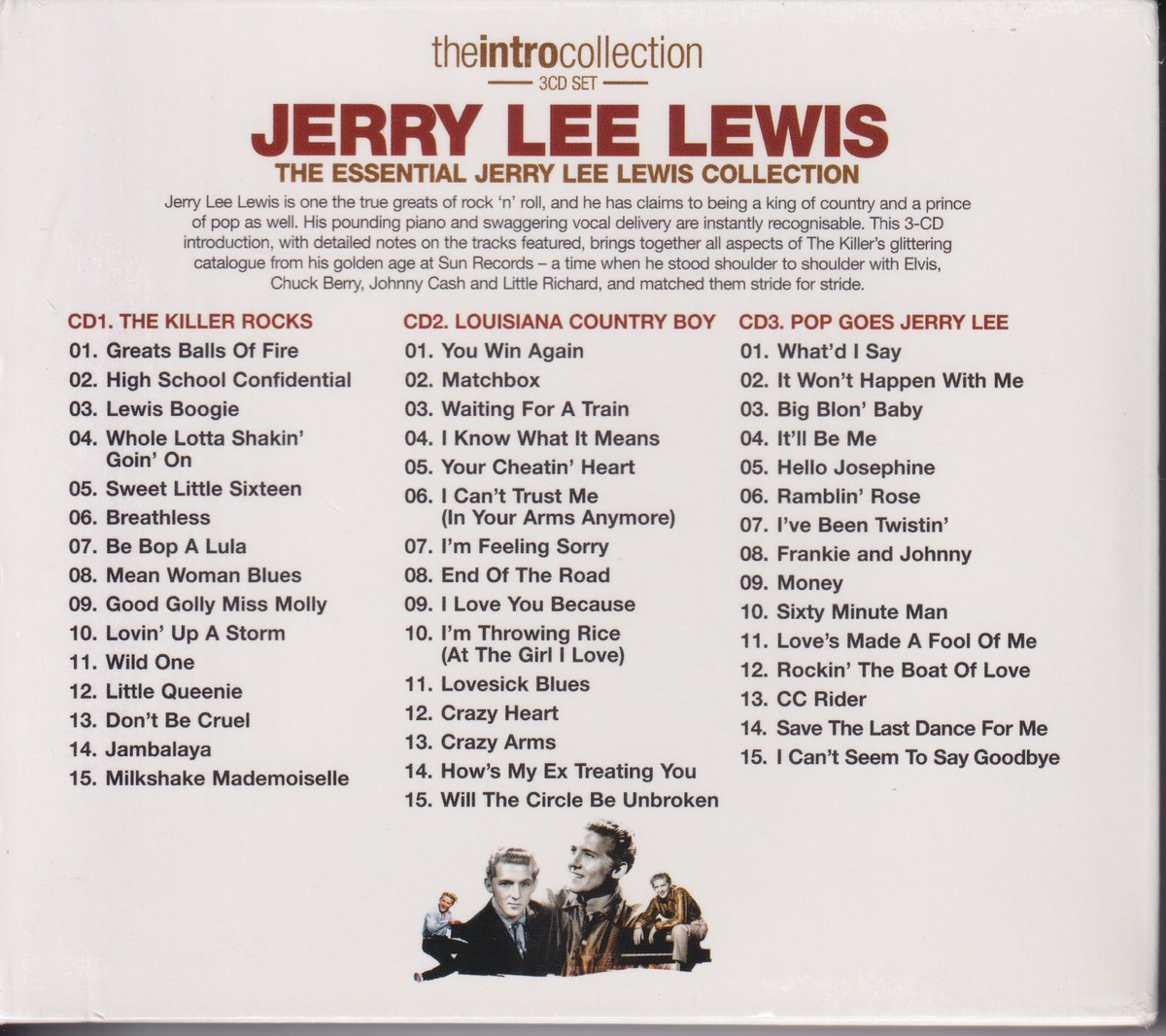 Country of release: UK Release Year: 2008 Edition: – Features: – Notes: – Tracklist: Disc 1/3 CD1. The Killer Rocks: 1-1 Great Balls Of Fire 1:53 1-2 High School Confidential 2:31 1-3 Lewis Boogie 2:01 1-4 Whole Lotta Shakin' Goin' On 2:54 1-5 Sweet Little Sixteen 2:56 1-6 Breathless 2:43 1-7 Be Bop A Lula 2:29 1-8 Mean Woman Blues 2:25 1-9 Good Golly Miss Molly 2:12 1-10 Lovin' Up A Storm 1:54 1-11 Wild One 1:56 1-12 Little Queenie 2:25 1-13 Don't Be Cruel 2:00 1-14 Jambalaya 2:01 1-15 Milkshake Mademoiselle 2:13 Disc 2/3 CD2. Louisiana Country Boy: 2-1 You Win Again 2:57 2-2 Matchbox 1:52 2-3 Waiting For A Train 1:43 2-4 I Know What It Means 2:41 2-5 Your Cheatin' Heart 1:47 2-6 I Can't Trust Me (In Your Arms Anymore) 2:14 2-7 I'm Feeling Sorry 2:41 2-8 End Of The Road 1:50 2-9 I Love You Because 3:04 2-10 I'm Throwing Rice (At The Girl I Love) 2:16 2-11 Lovesick Blues 2:10 2-12 Crazy Heart 2:50 2-13 Crazy Arms 2:45 2-14 How's My Ex Treating You 2:38 2-15 Will The Circle Be Unbroken 2:23 Disc 3/3 CD3. Pop Goes Jerry Lee: 3-1 What'd I Say 2:29 3-2 It Won't Happen With Me 2:58 3-3 Big Blon' Baby 1:43 3-4 It'll Be Me 2:16 3-5 Hello Josephine 2:20 3-6 Ramblin' Rose 3:02 3-7 I've Been Twistin' 3:16 3-8 Frankie And Johnny 2:34 3-9 Money 2:36 3-10 Sixty Minute Man 1:53 3-11 Love's Made A Fool Of Me 2:48 3-12 Rockin' The Boat Of Love 2:41 3-13 CC Rider 2:27 3-14 Save The Last Dance For Me 1:54 3-15 I Can't Seem To Say Goodbye 2:33 More pictures, click to view full size:
