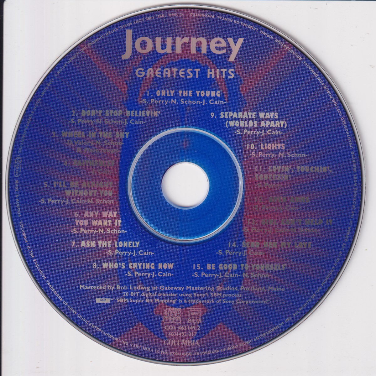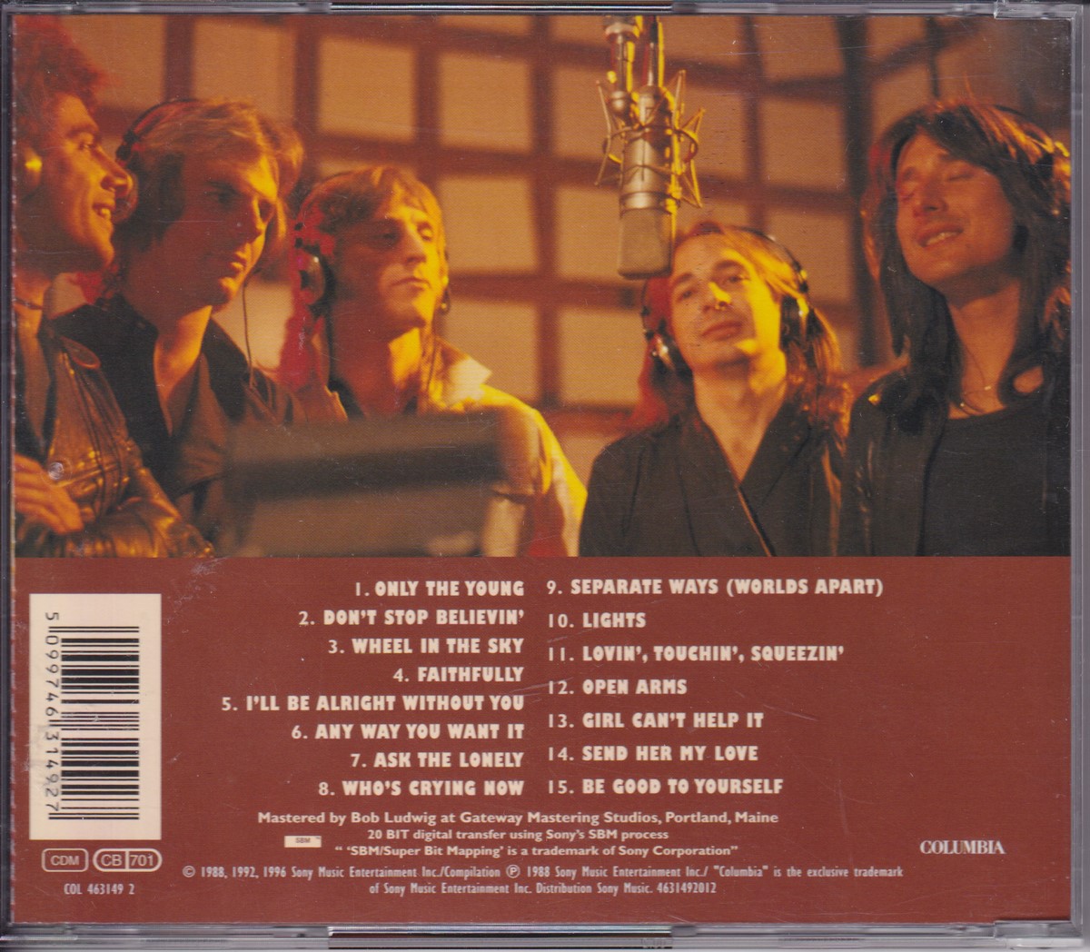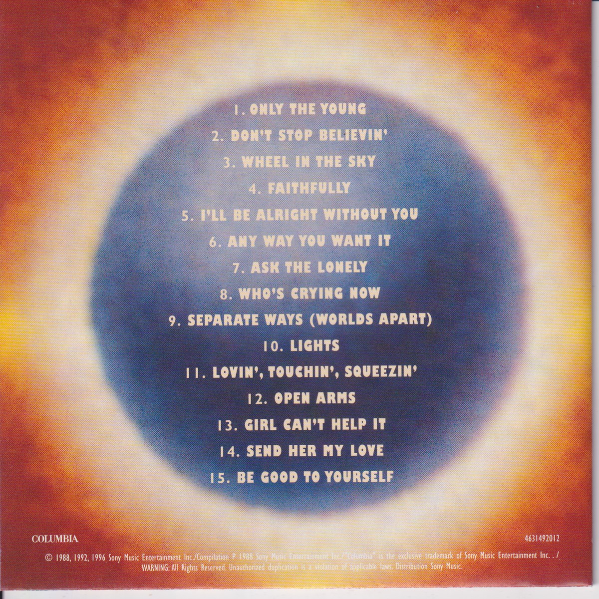 Country of release: Europe Release Year: – Edition: – Features: Compilation Notes: – Tracklist: 1 Only The Young 4:04 2 Don't Stop Believin' 4:10 3 Wheel In The Sky 4:11 4 Faithfully 4:27 5 I'll Be Alright Without You 4:33 6 Any Way You Want It 3:23 7 Ask The Lonely 3:54 8 Who's Crying Now 5:01 9 Separate Ways (Worlds Apart) 5:25 10 Lights 3:10 11 Lovin', Touchin', Squeezin' 3:50 12 Open Arms 3:18 13 Girl Can't Help It 3:50 14 Send Her My Love 3:54 15 Be Good To Yourself 3:51 More pictures, click to view full size: