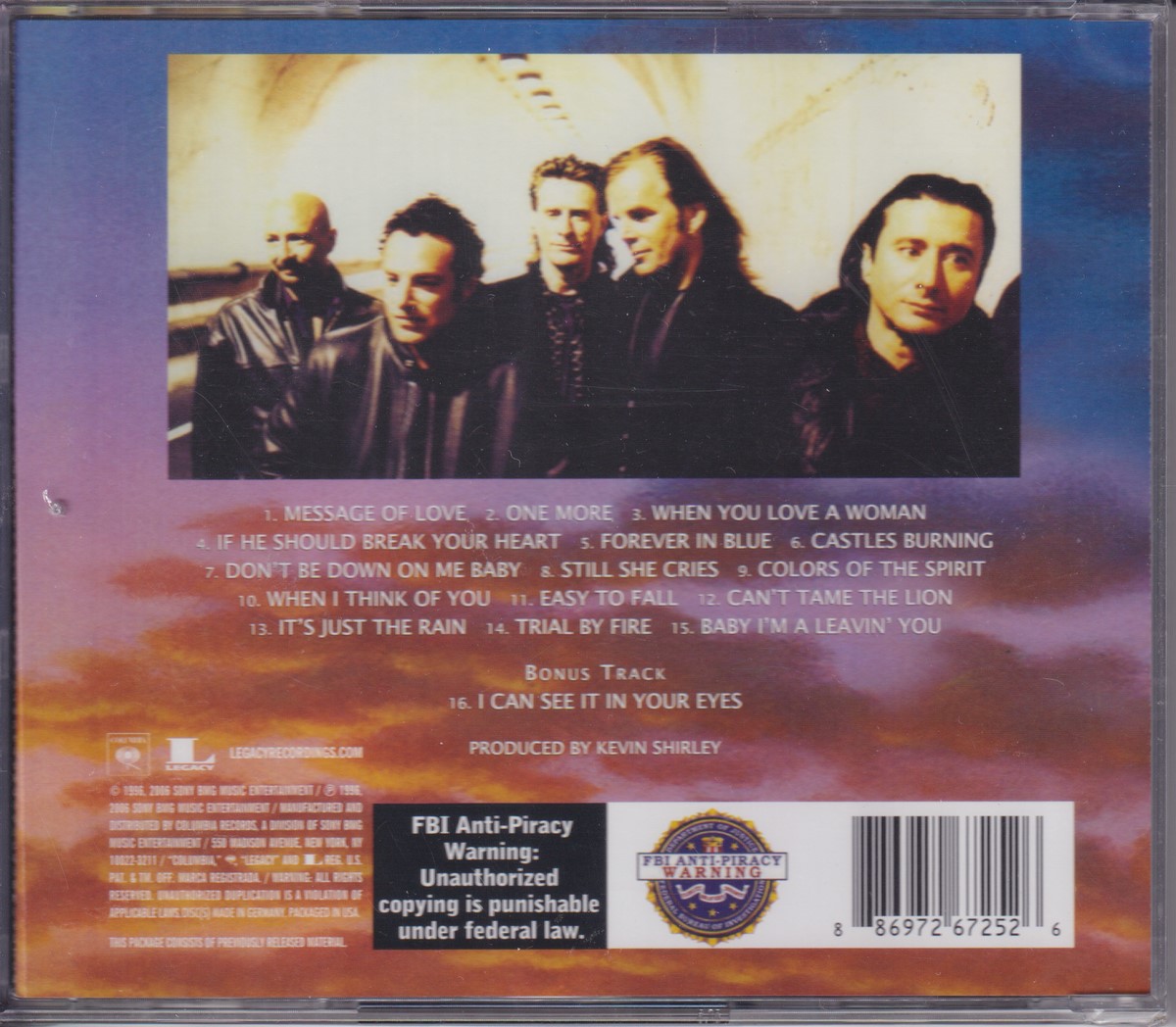 Country of release: US Release Year: – Edition: Reissue, Remastered Features: Import (non‑UK release), Remastered Notes: – Tracklist: 1 Message Of Love 2 One More 3 When You Love A Woman 4 If He Should Break Your Heart 5 Forever In Blue 6 Castles Burning 7 Don't Be Down On Me Baby 8 Still She Cries 9 Colors Of The Spirit 10 When I Think Of You 11 Easy To Fall 12 Can't Tame The Lion 13 It's Just The Rain 14 Trial By Fire 15 Baby I'm A Leavin' You Bonus Track: 16 I Can See It In Your Eyes (Bonus Track) More pictures, click to view full size: