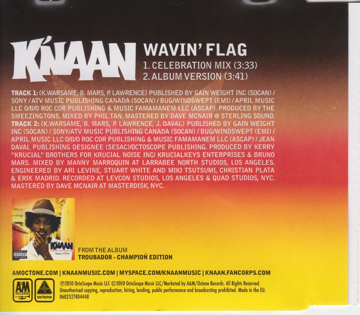 Country of release: Europe Release Year: 2010 Edition: – Features: – Notes: – Tracklist: 1 Wavin' Flag (Celebration Mix) 3:33 2 Wavin' Flag (Album Version) 3:41 More pictures, click to view full size: