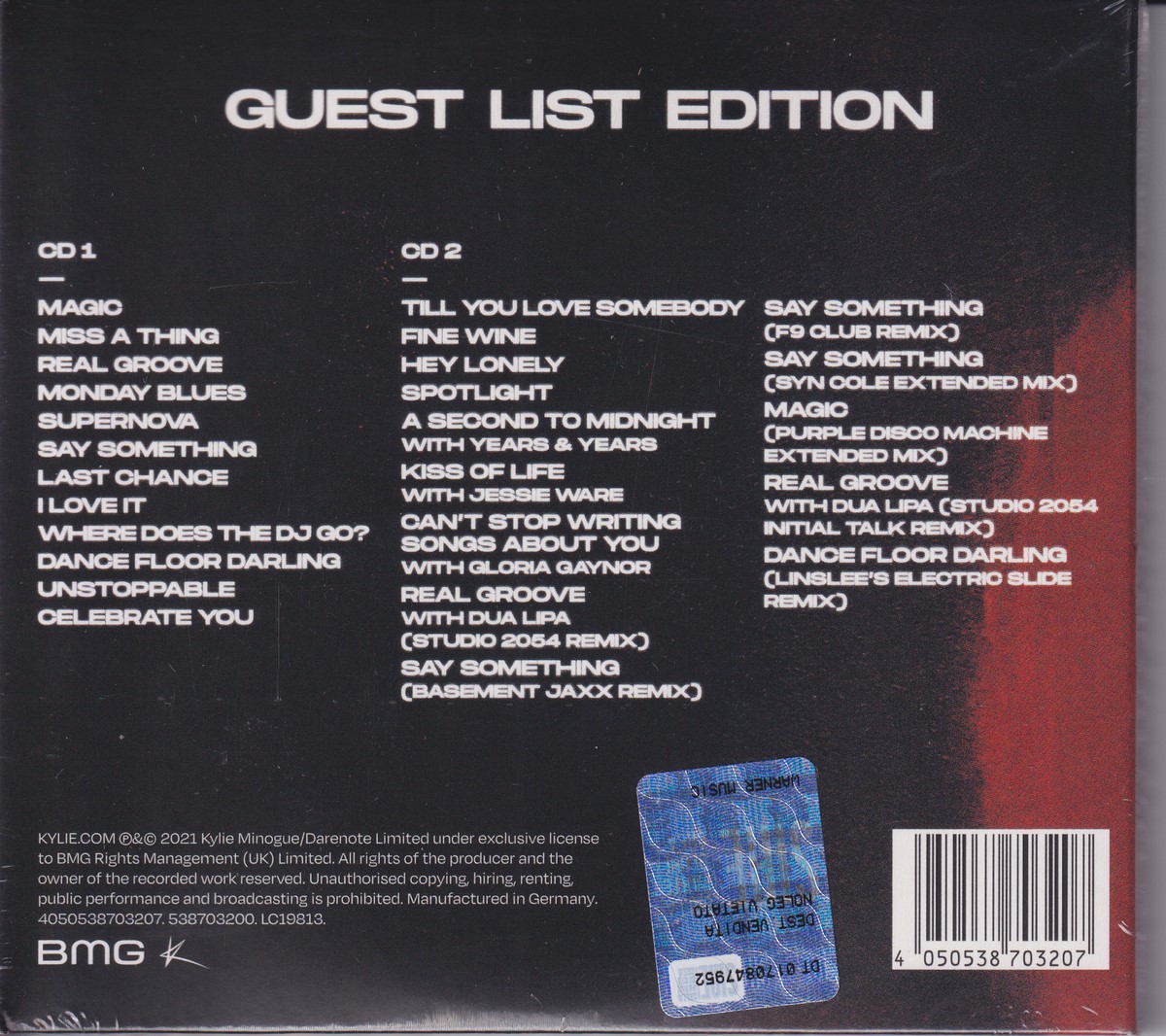 Country of release: Europe Release Year: 2021 Edition: – Features: – Notes: – Tracklist: Disc 1/2: 1-1 Magic 4:11 1-2 Miss A Thing 3:56 1-3 Real Groove 3:15 1-4 Monday Blues 3:09 1-5 Supernova 3:18 1-6 Say Something 3:33 1-7 Last Chance 3:04 1-8 I Love It 3:50 1-9 Where Does The DJ Go? 3:02 1-10 Dance Floor Darling 3:13 1-11 Unstoppable 3:35 1-12 Celebrate You 3:41 Disc 2/2: 2-1 Till You Love Somebody 3:03 2-2 Fine Wine 2:44 2-3 Hey Lonely 3:28 2-4 Spotlight 2:44 2-5 A Second To Midnight 3:28 2-6 Kiss Of Life 3:14 2-7 Can't Stop Writing Songs About You 3:04 2-8 Real Groove (Studio 2054 Remix) 4:23 2-9 Say Something (Basement Jaxx Remix) 5:23 2-10 Say Something (F9 Club Mix) 6:34 2-11 Say Something (Syn Cole Extended Mix) 4:05 2-12 Magic (Purple Disco Machine Extended Mix) 5:08 2-13 Real Groove (Studio 2054 Initial Talk Remix) 3:45 2-14 Dance Floor Darling (Linslee's Electric Slide Remix) 3:56 More pictures, click to view full size: