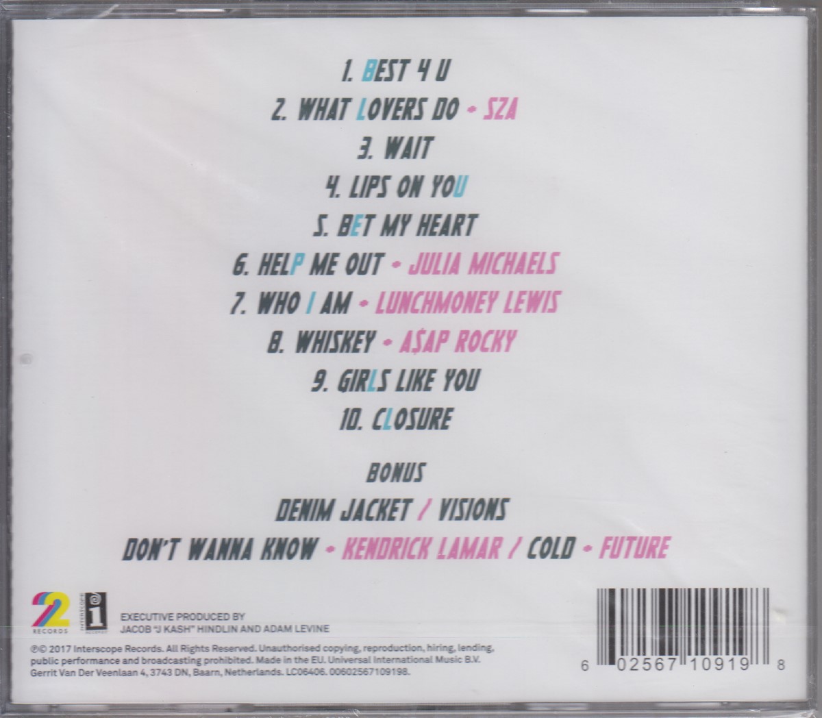 Format: CD Freetext: – Type: Album Number in Set: 1 Case Type: Standard jewel case Label & Cat.no.: 222 Records (2) – 00602567109198 Interscope Records – 00602567109198 |