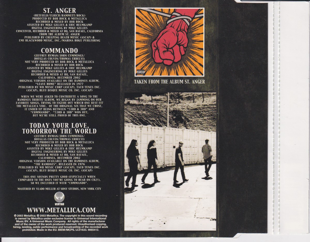 Country of release: UK Release Year: 2003 Edition: Parental Advisory Features: – Notes: – Tracklist: 1 St. Anger (Album Version) 7:23 2 Commando 1:49 3 Today Your Love, Tomorrow The World 2:13 More pictures, click to view full size: