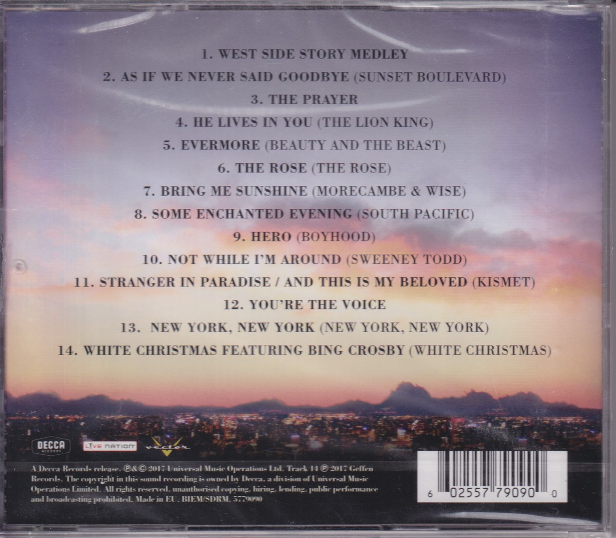 Country of release: UK Release Year: 2017 Edition: – Features: – Notes: – Tracklist: 1 West Side Story Medley 2 As If We Never Said Goodbye 3 The Prayer 4 He Lives In You 5 Evermore 6 The Rose 7 Bring Me Sunshine 8 Some Enchanted Evening 9 Hero 10 Not While I'm Around 11 Stranger In Paradise/And This Is My Beloved 12 You're The Voice 13 New York, New York 14 White Christmas • Featuring – Bing Crosby More pictures, click to view full size: