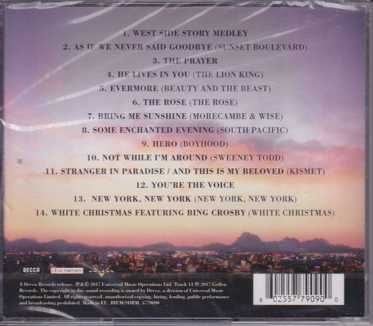 Country of release: UK Release Year: 2017 Edition: – Features: – Notes: – Tracklist: 1 West Side Story Medley 2 As If We Never Said Goodbye 3 The Prayer 4 He Lives In You 5 Evermore 6 The Rose 7 Bring Me Sunshine 8 Some Enchanted Evening 9 Hero 10 Not While I'm Around 11 Stranger In Paradise/And This Is My Beloved 12 You're The Voice 13 New York, New York 14 White Christmas • Featuring – Bing Crosby More pictures, click to view full size: