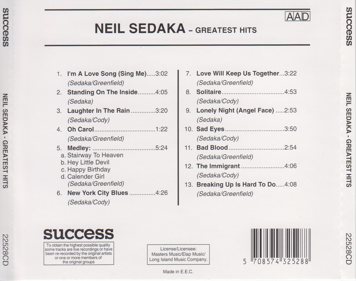 Country of release: Europe Release Year: 1991 Edition: – Features: Compilation Notes: – Tracklist: 1 I'm A Song (Sing Me) 3:03 2 Standing On The Inside 4:05 3 Laughter In The Rain 3:21 4 Oh Carol 1:23 5 Medley 5:24 5.1 Stairway To Heaven 1:09 5.2 Little Devil 0:48 5.3 Happy Birthday Sweet Sixteen 1:38 5.4 Calendar Girl 1:49 6 New York City Blues 4:27 7 Love Will Keep Us Together 3:23 8 Solitaire 4:55 9 Lonely Night (Angel Face) 2:56 10 Sad Eyes 3:55 11 Bad Blood 2:58 12 The Immigrant 4:08 13 Breaking Up Is Hard To Do 4:09 More pictures, click to view full size: