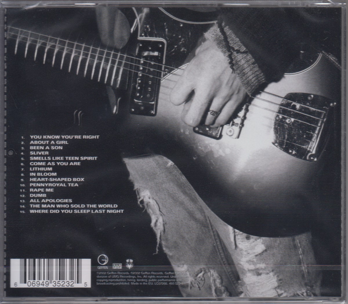 Country of release: Europe Release Year: – Edition: – Features: – Notes: – Tracklist: 1 You Know You're Right 3:38 2 About A Girl 2:49 3 Been A Son 2:23 4 Sliver 2:14 5 Smells Like Teen Spirit 5:01 6 Come As You Are 3:39 7 Lithium 4:17 8 In Bloom 4:15 9 Heart-Shaped Box 4:41 10 Pennyroyal Tea 3:38 11 Rape Me 2:51 12 Dumb 2:34 13 All Apologies 3:47 14 The Man Who Sold The World 3:49 15 Where Did You Sleep Last Night 5:02 More pictures, click to view full size: