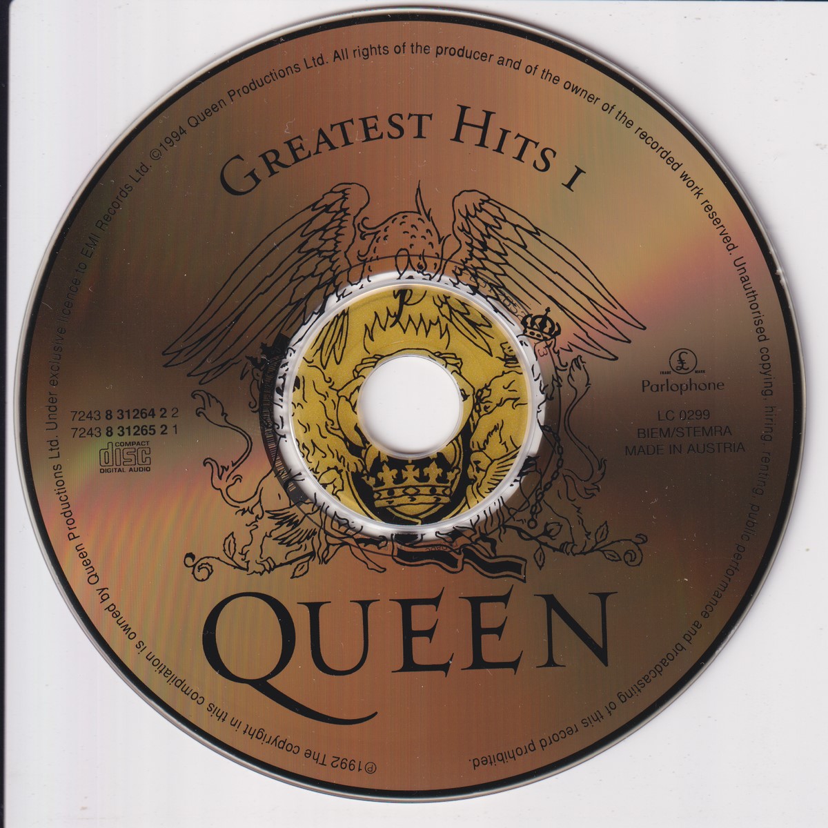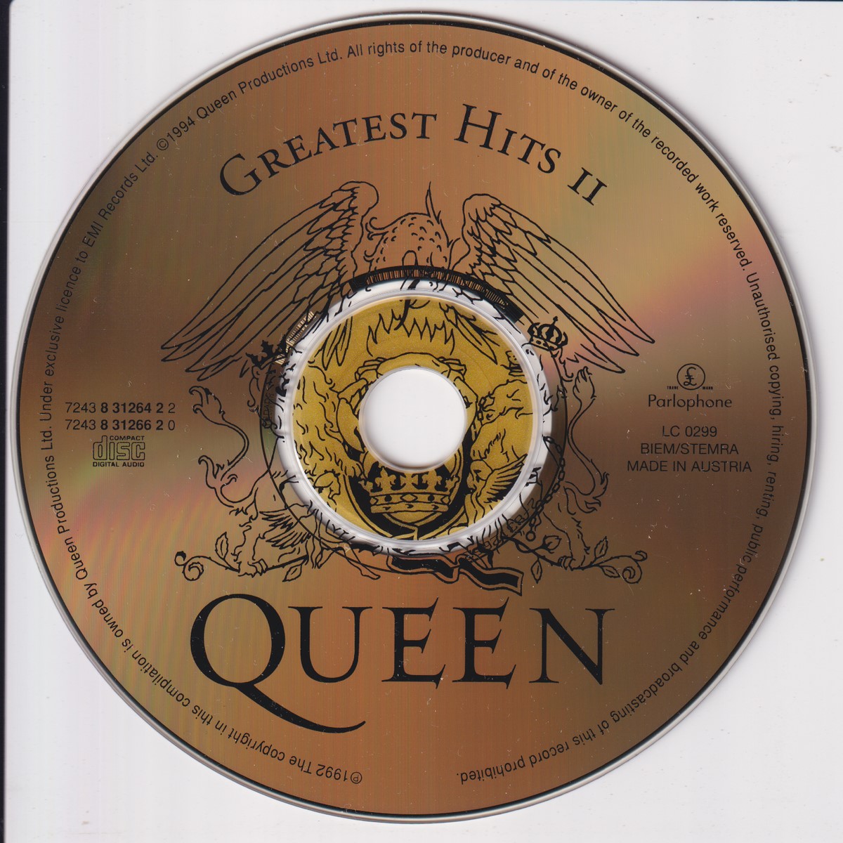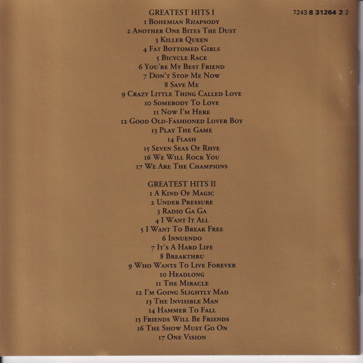 Country of release: UK Release Year: 1994 Edition: – Features: Compilation Notes: – Tracklist: Disc 1/2 Greatest Hits I: 1-1 Bohemian Rhapsody 1-2 Another One Bites The Dust 1-3 Killer Queen 1-4 Fat Bottomed Girls 1-5 Bicylce Race 1-6 You're My Best Friend 1-7 Don't Stop Me Now 1-8 Save Me 1-9 Crazy Little Thing Called Love 1-10 Somebody To Love 1-11 Now I'm Here 1-12 Good Old-Fashioned Lover Boy 1-13 Play The Game 1-14 Flash 1-15 Seven Seas Of Rhye 1-16 We Will Rock You 1-17 We Are The Champions Disc 2/2 Greatest Hits II: 2-1 A Kind Of Magic 2-2 Under Pressure feat. David Bowie 2-3 Radio Ga Ga 2-4 I Want It All 2-5 I Want To Break Free 2-6 Innuendo 2-7 It's A Hard Life 2-8 Breakthru 2-9 Who Wants To Live Forever 2-10 Headlong 2-11 The Miracle 2-12 I'm Going Slightly Mad 2-13 The Invisible Man 2-14 Hammer To Fall 2-15 Friends Will Be Friends 2-16 The Show Must Go On 2-17 One Vision More pictures, click to view full size: