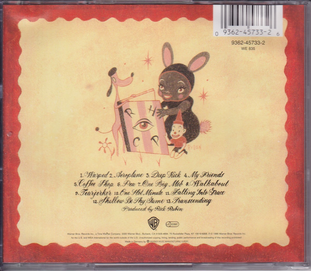 Country of release: Europe Release Year: 1995 Edition: Parental Advisory Features: – Notes: – Tracklist: 1 Warped 5:04 2 Aeroplane 4:45 3 Deep Kick 6:33 4 My Friends 4:02 5 Coffee Shop 3:08 6 Pea 1:47 7 One Big Mob 6:02 8 Walkabout 5:07 9 Tearjerker 4:19 10 One Hot Minute 6:23 11 Falling Into Grace 3:48 12 Shallow Be Thy Game 4:34 13 Transcending 5:46 More pictures, click to view full size: