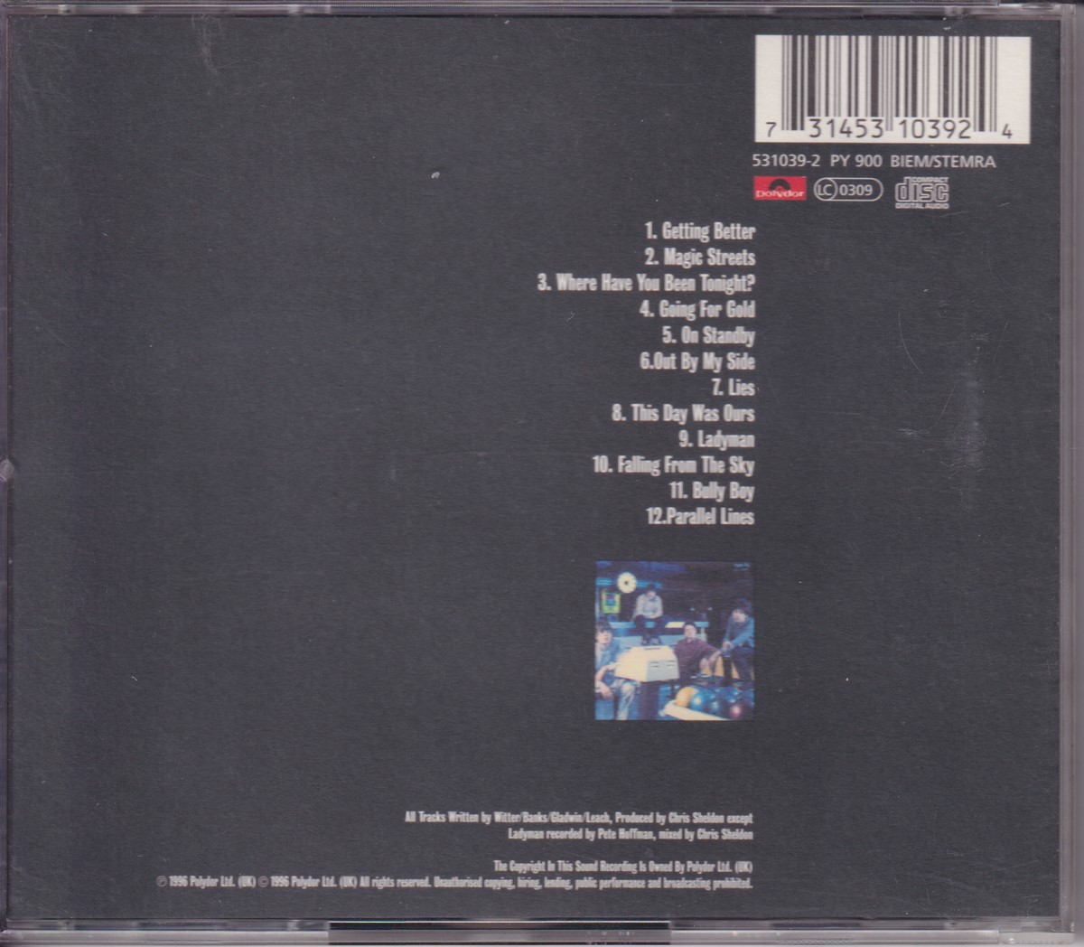 Country of release: Europe Release Year: 1996 Edition: – Features: – Notes: – Tracklist: 1 Getting Better 4:12 2 Magic Streets 4:05 3 Where Have You Been Tonight? 3:45 4 Going For Gold 4:25 5 On Standby 3:55 6 Out By My Side 2:28 7 Lies 4:12 8 This Day Was Ours 3:23 9 Ladyman 4:16 10 Falling From The Sky 3:56 11 Bully Boy 3:15 12 Parallel Lines 8:43 More pictures, click to view full size: