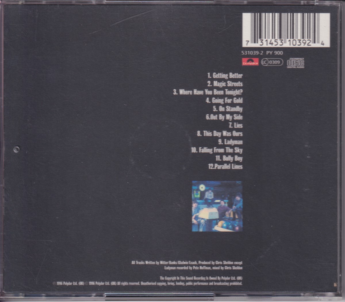 Country of release: UK Release Year: 1996 Edition: – Features: – Notes: – Tracklist: 1 Getting Better 4:12 2 Magic Streets 4:05 3 Where Have You Been Tonight? 3:45 4 Going For Gold 4:25 5 On Standby 3:55 6 Out By My Side 2:28 7 Lies 4:12 8 This Day Was Ours 3:23 9 Ladyman 4:16 10 Falling From The Sky 3:56 11 Bully Boy 3:15 12 Parallel Lines 8:43 More pictures, click to view full size: