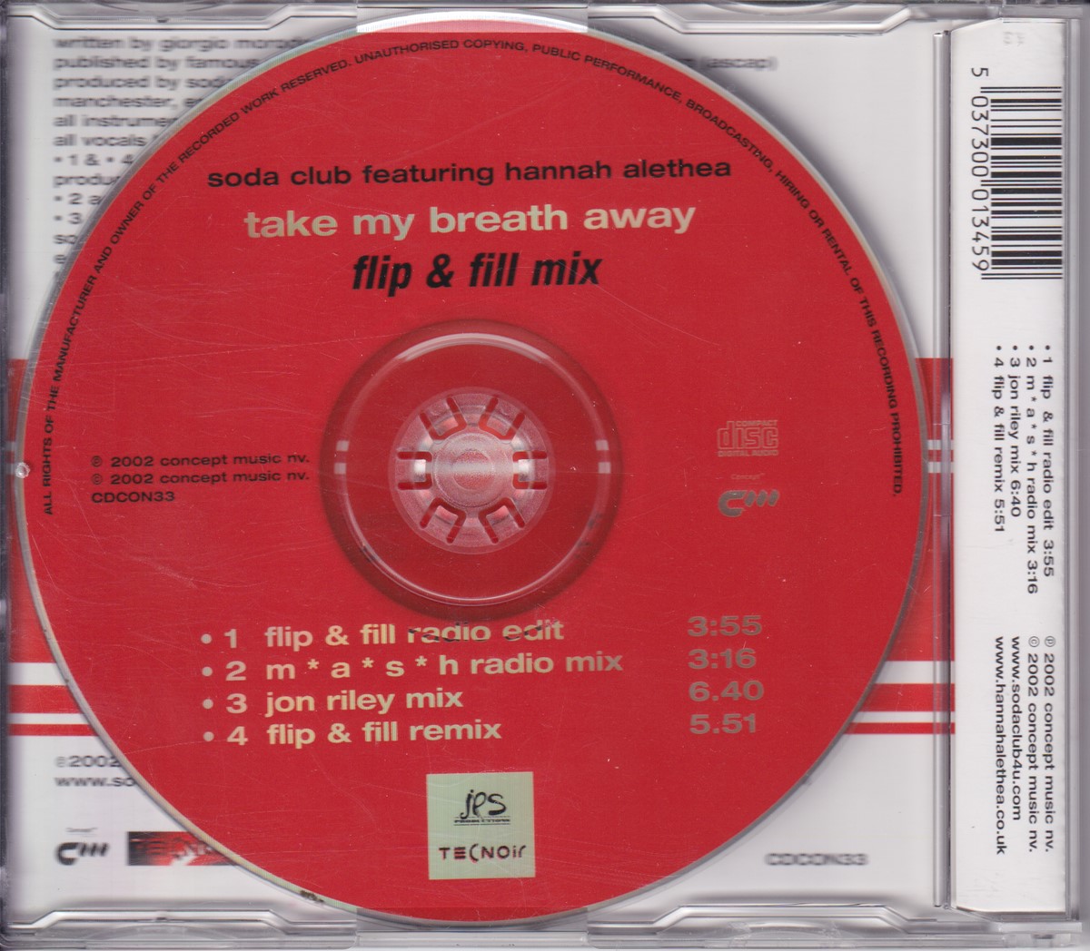 1: Media condition: Good (G) Sleeve condition: Near Mint (NM or M-) Condition Notes: – eBay listing: Soda Club featuring Hannah Alethea - Take My Breath Away (2002) VG Condition: Very Good Price: £1.05 https://www.ebay.co.uk/itm/116844007740