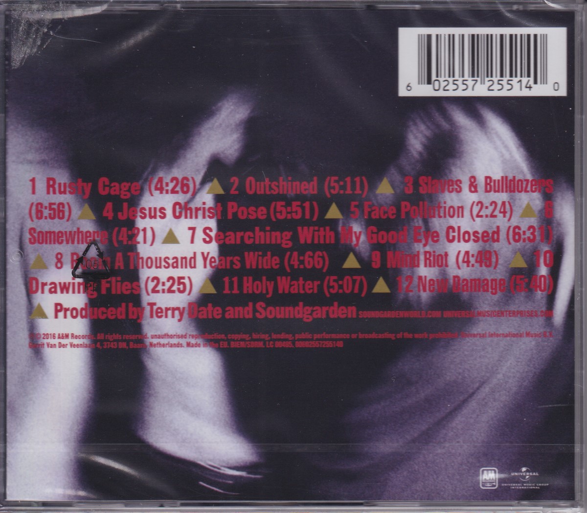 Country of release: – Release Year: – Edition: – Features: – Notes: – Tracklist: 1 Rusty Cage 4:26 2 Outshined 5:11 3 Slaves & Bulldozers 6:56 4 Jesus Christ Pose 5:51 5 Face Pollution 2:24 6 Somewhere 4:21 7 Searching With My Good Eye Closed 6:31 8 Room A Thousand Years Wide 4:06 9 Mind Riot 4:49 10 Drawing Flies 2:25 11 Holy Water 5:07 12 New Damage 5:40 More pictures, click to view full size: