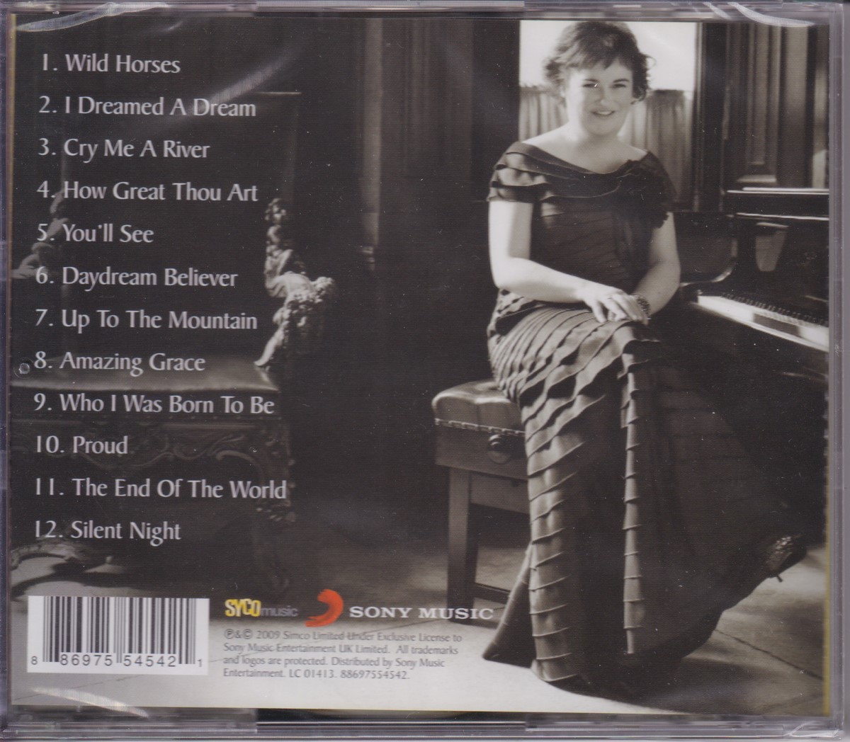 Country of release: UK & Europe Release Year: 2009 Edition: – Features: – Notes: – Tracklist: 1 Wild Horses 2 I Dreamed A Dream 3 Cry Me A River 4 How Great Thou Art 5 You'll See 6 Daydream Believer 7 Up To The Mountain 8 Amazing Grace 9 Who I Was Born To Be 10 Proud 11 The End Of The World 12 Silent Night More pictures, click to view full size: