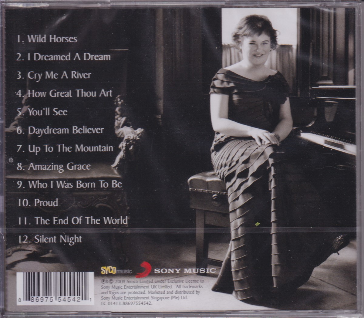 Country of release: UK & Europe Release Year: 2009 Edition: – Features: – Notes: – Tracklist: 1 Wild Horses 2 I Dreamed A Dream 3 Cry Me A River 4 How Great Thou Art 5 You'll See 6 Daydream Believer 7 Up To The Mountain 8 Amazing Grace 9 Who I Was Born To Be 10 Proud 11 The End Of The World 12 Silent Night More pictures, click to view full size: