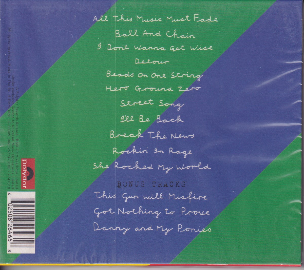 Country of release: Europe Release Year: 2019 Edition: Deluxe Edition Features: – Notes: – Tracklist: 1 All This Music Must Fade 2 Ball And Chain 3 I Don't Wanna Get Wise 4 Detour 5 Beads On One String 6 Hero Ground Zero 7 Street Song 8 I'll Be Back 9 Break The News 10 Rockin' In Rage 11 She Rocked My World Bonus Tracks: 12 This Gun Will Misfire 13 Got Nothing To Prove 14 Danny And My Ponies More pictures, click to view full size: