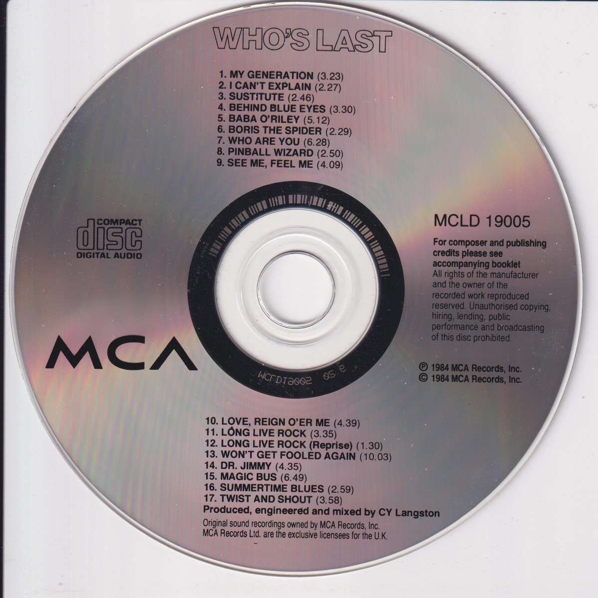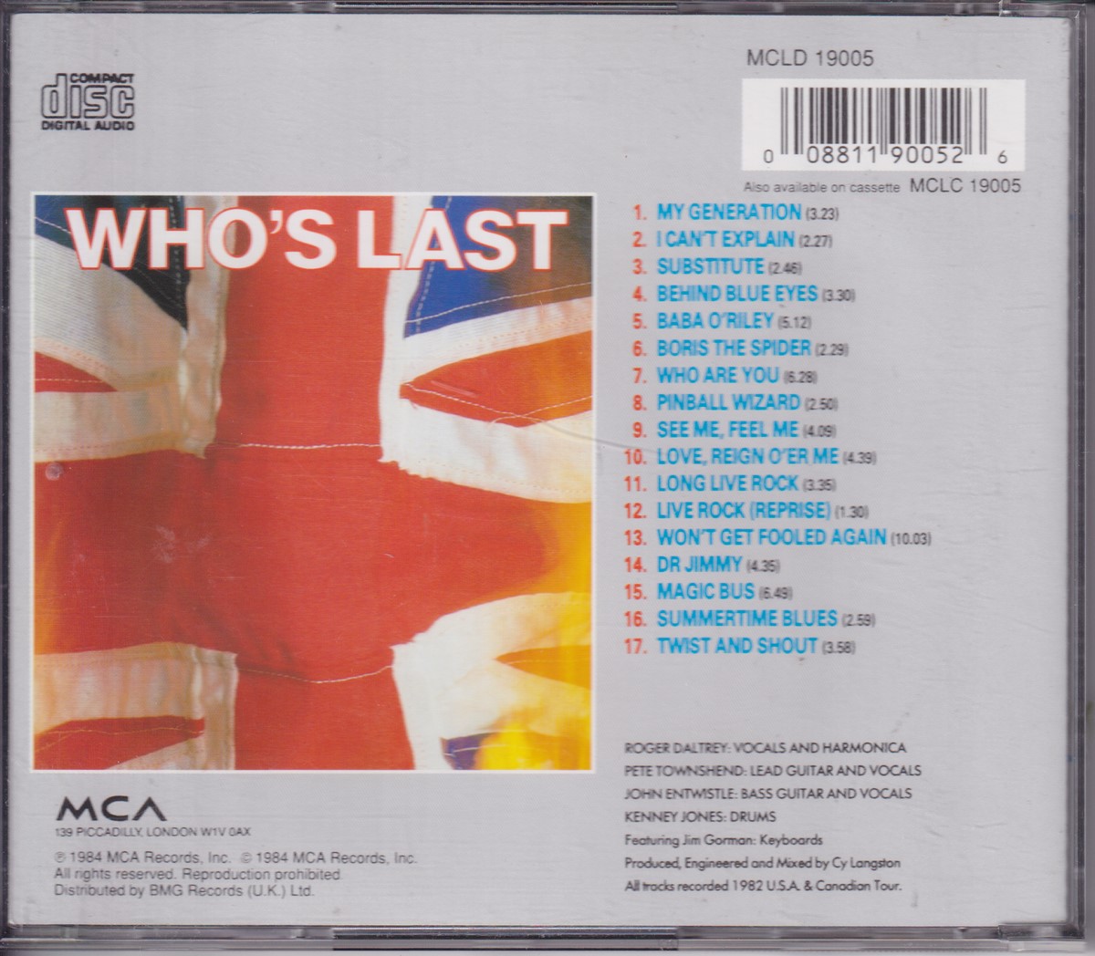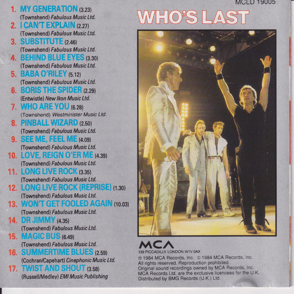 Country of release: UK Release Year: – Edition: – Features: – Notes: – Tracklist: 1 My Generation 3:23 2 I Can't Explain 2:27 3 Substitute 2:46 4 Behind Blue Eyes 3:30 5 Baba O'Riley 3:30 6 Boris The Spider 2:29 7 Who Are You 6:28 8 Pinball Wizard 2:50 9 See Me, Feel Me 4:09 10 Love, Reign Over Me 4:39 11 Long Live Rock 3:35 12 Long Live Rock (Reprise) 1:30 13 Won't Get Fooled Again 10:03 14 Dr. Jimmy 4:35 15 Magic Bus 6:49 16 Summertime Blues 2:59 17 Twist & Shout 3:58 More pictures, click to view full size: