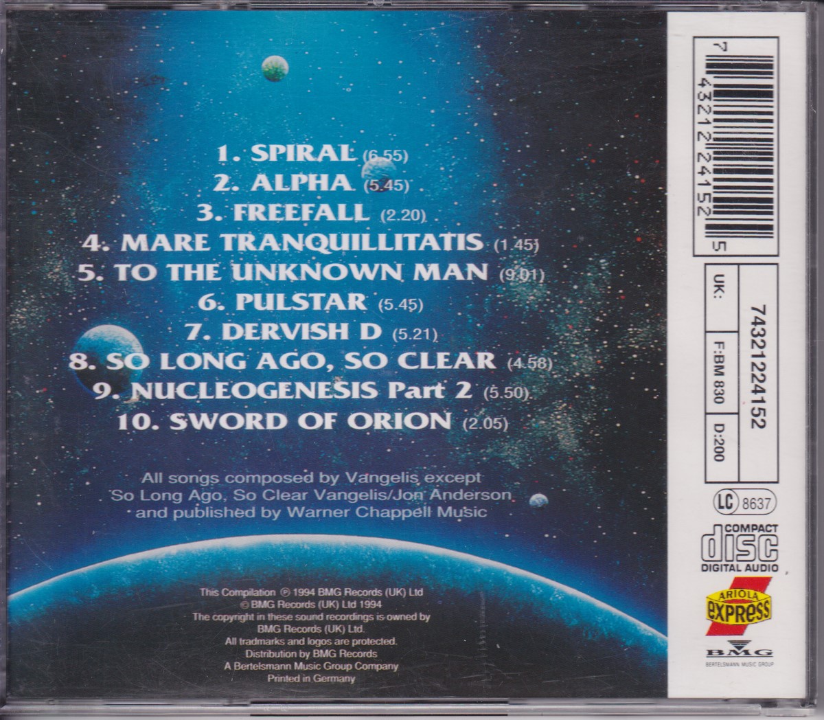 Country of release: Europe Release Year: – Edition: – Features: Compilation Notes: – Tracklist: 1 Spiral 7:00 2 Alpha 5:46 3 Freefall 2:16 4 Mare Tranquillitatis 1:48 5 To The Unknown Man 9:07 6 Pulstar 5:45 7 Dervish D 5:15 8 So Long Ago, So Clear 5:03 9 Nucleogenesis Part 2 6:12 10 Sword Of Orion 1:55 More pictures, click to view full size: