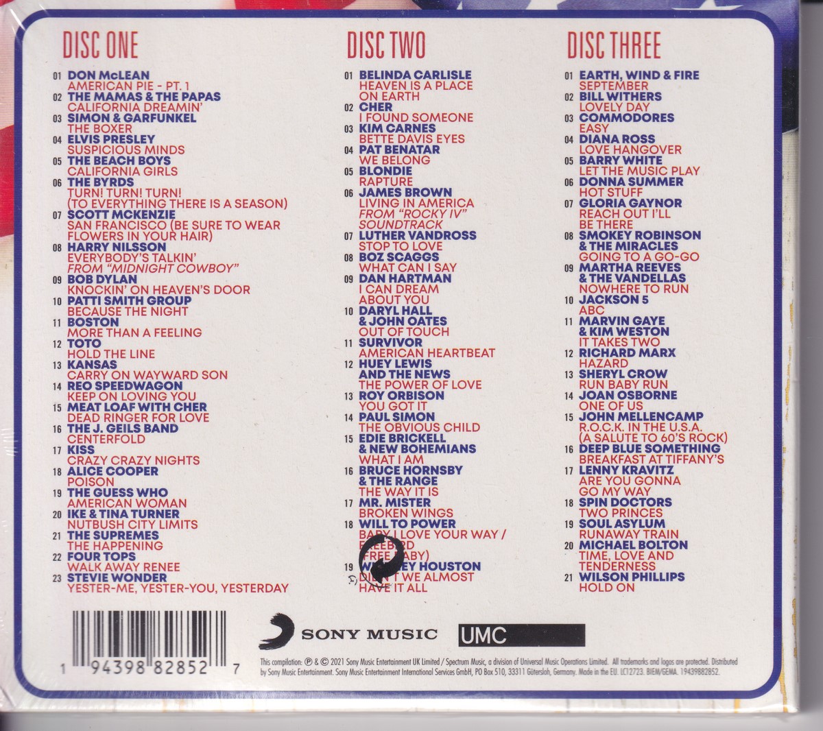 Country of release: UK Release Year: 2021 Edition: – Features: Compilation Notes: – Tracklist: Disc 1/3: 1-1 Don McLean – American Pie Pt.1 4:05 1-2 The Mamas & The Papas – California Dreamin' 2:38 1-3 Simon & Garfunkel – The Boxer 5:07 1-4 Elvis Presley – Suspicious Minds 4:26 1-5 The Beach Boys – California Girls 2:36 1-6 The Byrds – Turn! Turn! Turn! (To Everything There Is A Season) 3:49 1-7 Scott McKenzie – San Francisco (Be Sure To Wear Flowers In Your Hair) 2:57 1-8 Harry Nilsson – Everybody's Talkin' 2:39 1-9 Bob Dylan – Knockin' On Heaven's Door 2:29 1-10 Patti Smith Group – Because The Night 3:18 1-11 Boston – More Than A Feeling 3:26 1-12 Toto – Hold The Line 3:55 1-13 Kansas (2) – Carry On Wayward Son 3:25 1-14 REO Speedwagon – Keep On Loving You 3:19 1-15 Meat Loaf – Dead Ringer For Love 4:22 • Featuring – Cher 1-16 The J. Geils Band – Centrefold 3:36 1-17 Kiss – Crazy Crazy Nights 3:44 1-18 Alice Cooper (2) – Poison 4:29 1-19 The Guess Who – American Woman 3:46 1-20 Ike & Tina Turner – Nutbush City Limits 2:57 1-21 The Supremes – The Happening 2:50 1-22 Four Tops – Walk Away Renee 2:43 1-23 Stevie Wonder – Yester-Me, Yester-You, Yesterday 3:04 Disc 2/3: 2-1 Belinda Carlisle – Heaven Is A Place On Earth 3:52 2-2 Cher – I Found Someone 3:39 2-3 Kim Carnes – Bette Davis Eyes 3:43 2-4 Pat Benatar – We Belong 3:38 2-5 Blondie – Rapture 4:56 2-6 James Brown – Living In America 4:42 2-7 Luther Vandross – Stop To Love 4:21 2-8 Boz Scaggs – What Can I Say 2:58 2-9 Dan Hartman – I Can Dream About You 3:59 2-10 Daryl Hall & John Oates – Out Of Touch 4:05 2-11 Survivor – American Heartbeat 4:09 2-12 Huey Lewis & The News – The Power Of Love 3:54 2-13 Roy Orbison – You Got It 3:30 2-14 Paul Simon – The Obvious Child 4:08 2-15 Edie Brickell & New Bohemians – What I Am 4:55 2-16 Bruce Hornsby And The Range – The Way It Is 4:56 2-17 Mr. Mister – Broken Wings 4:21 2-18 Will To Power – Baby I Love Your Way/Freebird (Free Baby) 4:07 2-19 Whitney Houston – Didn't We Almost Have It All 4:34 Disc 3/3: 3-1 Earth, Wind & Fire – September 3:34 3-2 Bill Withers – Lovely Day 4:07 3-3 Commodores – Easy 4:11 3-4 Diana Ross – Love Hangover 3:44 3-5 Barry White – Let The Music Play 3:28 3-6 Donna Summer – Hot Stuff 3:41 3-7 Gloria Gaynor – Reach Out I'll Be There 3:05 3-8 The Miracles – Going To A Go-Go 2:46 3-9 Martha Reeves & The Vandellas – Nowhere To Run 2:56 3-10 The Jackson 5 – ABC 2:55 3-11 Marvin Gaye – It Takes Two 2:57 • Featuring – Kim Weston 3-12 Richard Marx – Hazard 4:45 3-13 Sheryl Crow – Run Baby Run 4:24 3-14 Joan Osborne – One Of Us 4:14 3-15 John Cougar Mellencamp – R.O.C.K. In The U.S.A. (A Salute To 60's Rock) 2:52 3-16 Deep Blue Something – Breakfast At Tiffany's 4:16 3-17 Lenny Kravitz – Are You Gonna Go My Way 3:30 3-18 Spin Doctors – Two Princes 4:13 3-19 Soul Asylum (2) – Runaway Train 4:21 3-20 Michael Bolton – Time, Love And Tenderness 4:15 3-21 Wilson Phillips – Hold On 4:24 More pictures, click to view full size:
