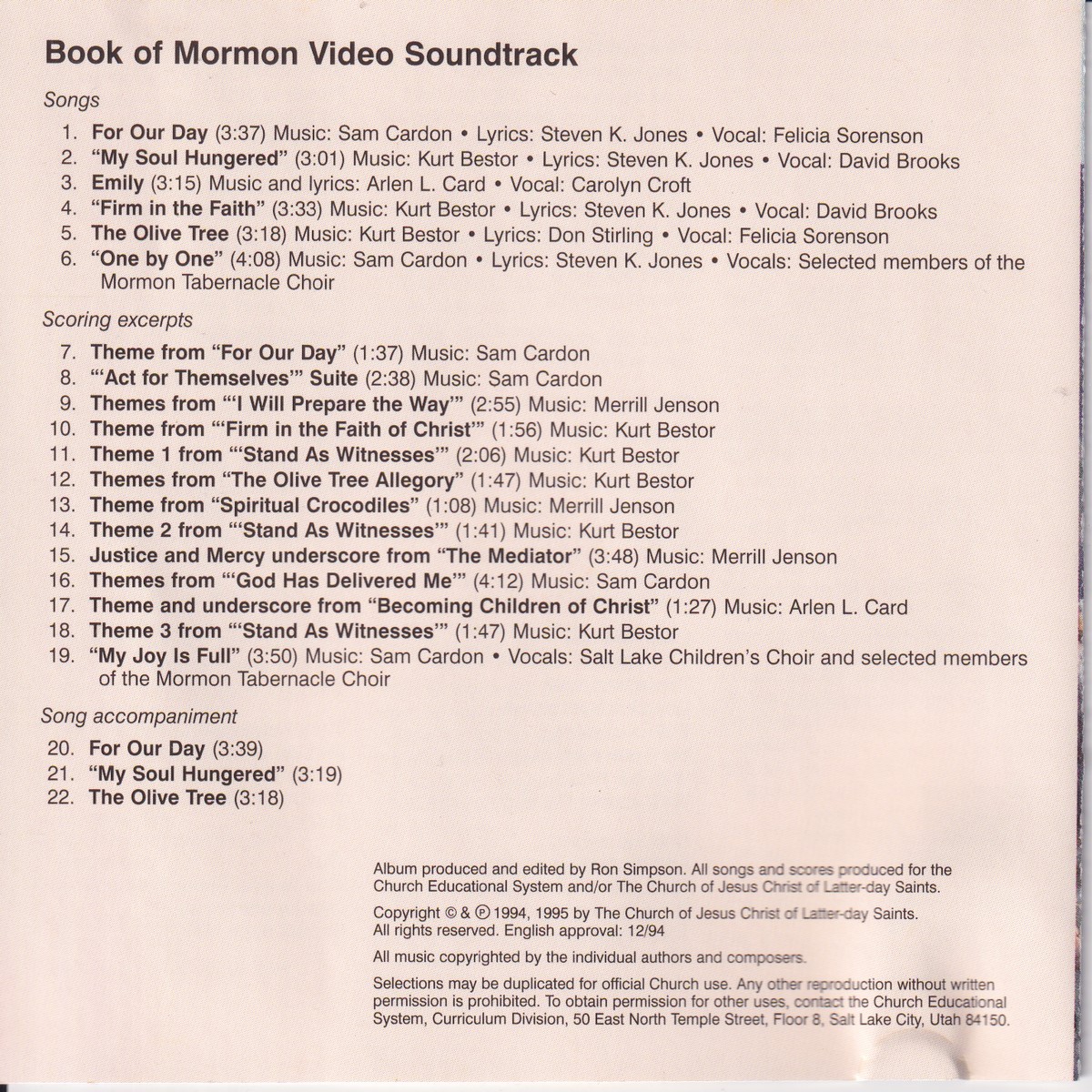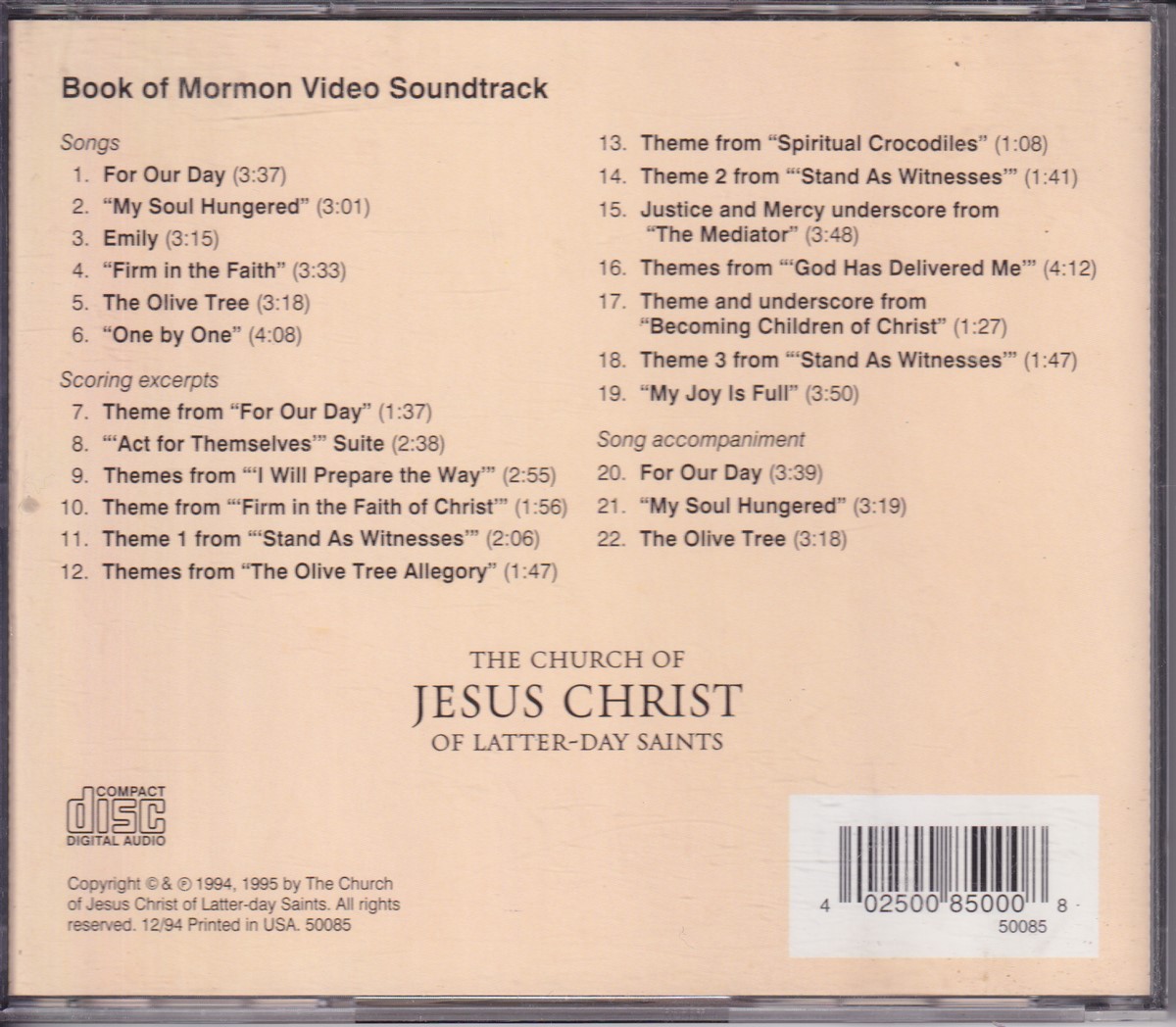 Format: CD Freetext: – Type: Album Number in Set: 1 Case Type: Standard jewel case Label & Cat.no.: The Church Of Jesus Christ Of Latter-day Saints – 50085 |