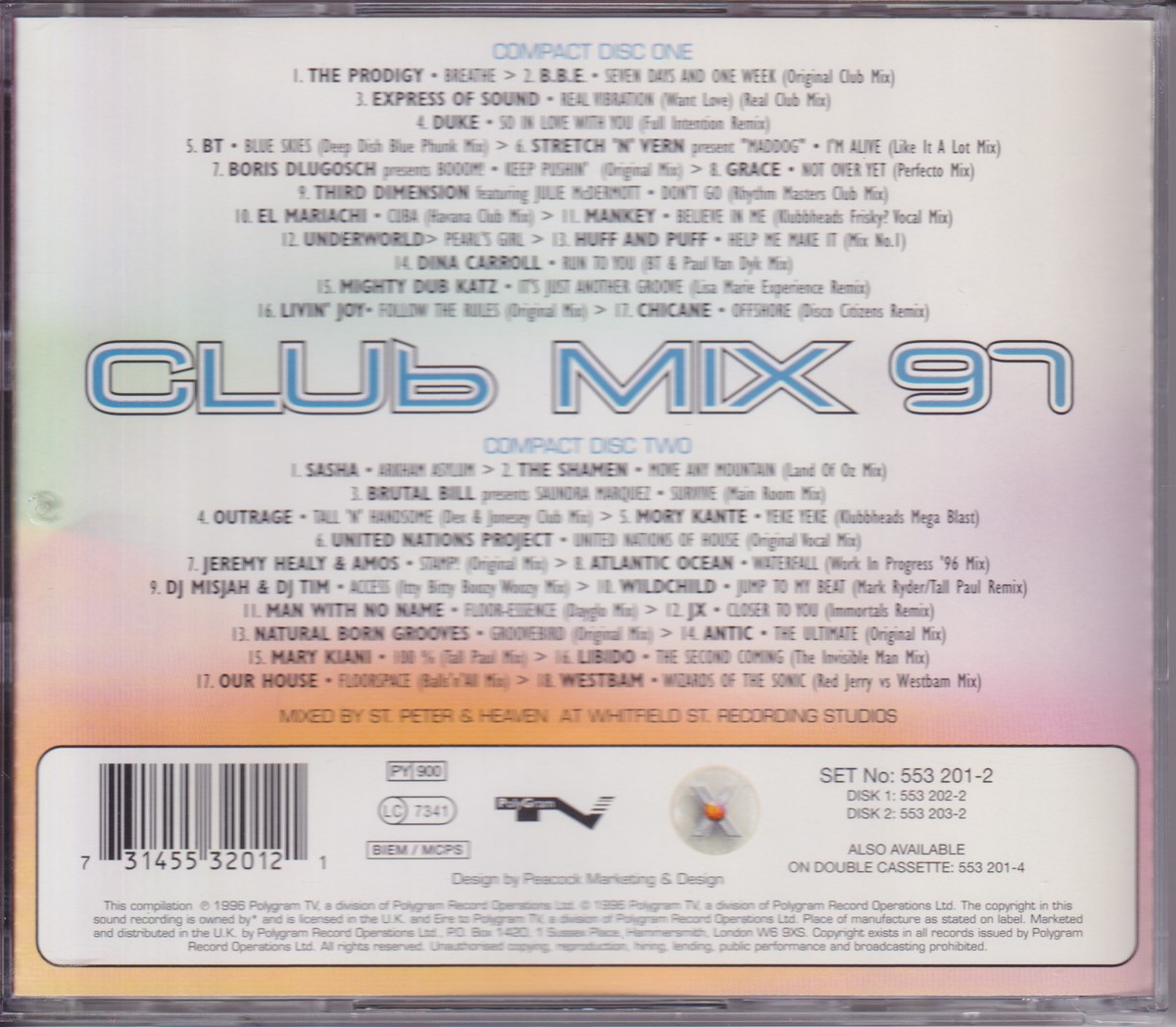 Country of release: UK Release Year: 1996 Edition: – Features: Mixed Notes: – Tracklist: Disc 1/2: 1-1 The Prodigy – Breathe 3:42 1-2 B.B.E. – Seven Days And One Week (Original Club Mix) 6:07 1-3 Express Of Sound – Real Vibration (Want Love) (Real Club Mix) 3:59 1-4 Duke – So In Love With You (Full Intention Remix) 5:55 • Remix – Full Intention 1-5 BT – Blue Skies (Deep Dish Blue Phunk Mix) 4:44 • Remix – Deep Dish 1-6 Stretch & Vern – I'm Alive (Like It A Lot Mix) 5:19 1-7 Booom! – Keep Pushin' (Original Mix) 3:50 1-8 Grace – Not Over Yet (Perfecto Mix) 4:49 • Remix – Perfecto 1-9 Third Dimension[3rd Dimension] – Don't Go (Rhythm Masters Club Mix) 4:56 • Remix – Rhythm Masters 1-10 El Mariachi – Cuba (Havana Club Mix) 5:09 1-11 Mankey – Believe In Me (Klubbheads Frisky? Vocal Mix) 4:56 • Remix – Klubbheads 1-12 Underworld – Pearl's Girl 4:31 1-13 Huff & Puff – Help Me Make It (Mix No. 1) 3:56 1-14 Dina Carroll – Run To You (BT & Paul Van Dyk Mix) 5:16 • Remix – BT, Paul van Dyk 1-15 Mighty Dub Katz – It's Just Another Groove (Lisa Marie Experience Remix) 4:36 • Remix – Lisa Marie Experience 1-16 Livin' Joy – Follow The Rules (Original Mix) 2:29 1-17 Chicane – Offshore (Disco Citizens Remix) 4:14 • Remix – Disco Citizens Disc 2/2: 2-1 Sasha – Arkham Asylum 4:09 2-2 The Shamen – Move Any Mountain (Land Of Oz Mix) 3:37 2-3 Brutal Bill – Survive (Main Room Mix) 4:22 • Featuring – Saundra Marquez 2-4 Outrage – Tall 'N' Handsome (Dex & Jonesey Club Mix) 5:42 • Remix – Dex & Jonesey 2-5 Mory Kanté – Yeke Yeke (Klubbheads Mega Blast) 4:24 • Remix – Klubbheads 2-6 United Nations Project – United Nations Of House (Original Vocal Mix) 3:16 2-7 Jeremy Healy & Amos – Stamp! (Original Mix) 4:26 2-8 Atlantic Ocean – Waterfall (Work In Progress '96 Mix) 3:56 • Remix – Work In Progress 2-9 DJ Misjah & DJ Tim – Access (Itty Bitty Boozy Woozy Mix) 4:45 • Remix – Itty Bitty Boozy Woozy 2-10 Wildchild – Jump To My Beat (Mark Ryder/Tall Paul Remix) 3:55 • Remix – Mark Ryder, Tall Paul 2-11 Man With No Name – Floor-Essence (Dayglo Mix) 4:20 2-12 JX – Closer To You (Immortals Remix) 6:29 • Remix – The Immortals (4) 2-13 Natural Born Grooves – Groovebird (Original Mix) 2:33 2-14 Antic – The Ultimate (Original Mix) 3:31 2-15 Mary Kiani – 100% (Tall Paul Mix) 4:24 • Remix – Tall Paul 2-16 Libido – The Second Coming (The Invisible Man Mix) 3:27 • Remix – The Invisible Man (3) 2-17 Our House – Floorspace (Balls 'n' All Mix) 5:55 2-18 WestBam – Wizards Of The Sonic (Red Jerry vs. Westbam Mix) 5:19 • Remix – Red Jerry More pictures, click to view full size:
