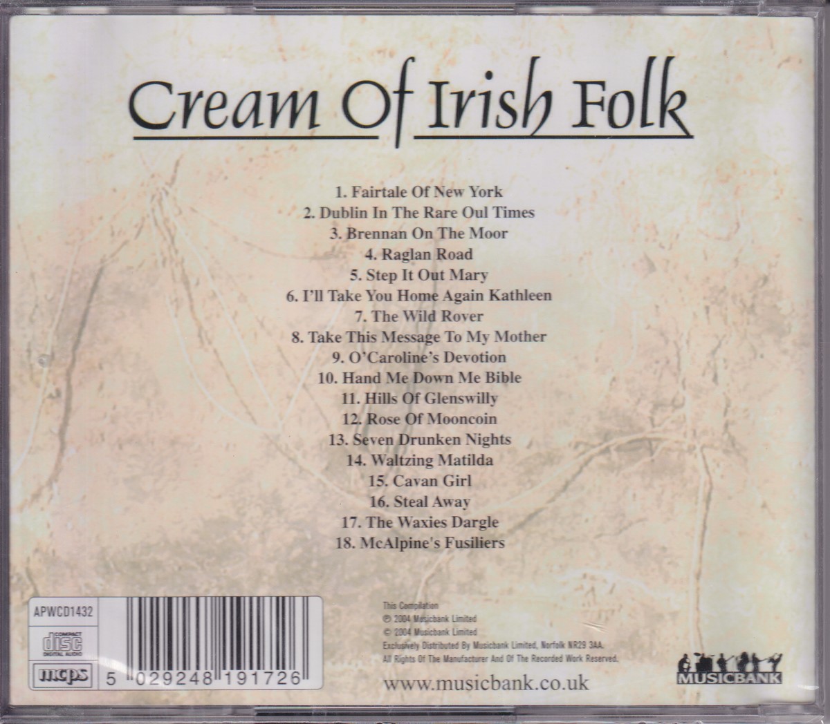 Country of release: UK Release Year: 2004 Edition: – Features: Compilation Notes: – Tracklist: 1 Dingle Folk With Kiera Dawn – Fairytale Of New York 2 The Dublin Folk Band – Dublin In The Rare Old Times 3 Galway City Ramblers – Brennan On The Moor 4 Kiera Dawn – Raglan Road 5 Galway City Ramblers – Step It Out Mary 6 Maggie Kennedy – I'll Take You Home Again Kathleen 7 The Dublin Folk Band – The Wild Rover 8 Gloria Furey – Take This Message To My Mother 9 The Dublin Folk Band – O'Caroline's Devotion 10 Hugo Docherty – Hand Me Down Me Bible 11 Maggie Kennedy – Hills Of Glenswilly 12 Paddy Kelly – Rose Of Mooncoin 13 The Dublin Folk Band – Seven Drunken Nights 14 The Dublin Folk Band – Waltzing Matilda 15 Paddy Kelly – Cavan Girl 16 The Davey Brothers – Steal Away 17 Galway City Ramblers – The Waxies Durgle 18 Dingle Folk – McAlpine's Fusiliers More pictures, click to view full size: