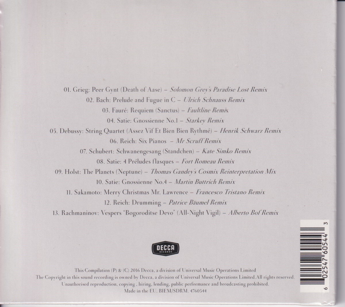 Country of release: UK Release Year: 2016 Edition: – Features: Compilation Notes: – Tracklist: 1 Edvard Grieg – Peer Gynt (Death Of Aase) (Solomon Grey’s Paradise Lost Remix) 4:07 2 Johann Sebastian Bach – Prelude And Fugue In C (Ulrich Schnauss Remix) 4:28 3 Gabriel Fauré – Requiem (Sanctus) (Faultline Remix) 4:36 4 Erik Satie – Gnossienne No.1 (Starkey Remix) 5:25 5 Claude Debussy – String Quartet (Assez Vif Et Bien Bien Rythmé) (Henrik Schwarz Remix) 5:50 6 Reich[Steve Reich] – Six Pianos (Mr Scruff Remix) 6:33 7 Franz Schubert – Schwanengesang (Standchen) (Kate Simko Remix) 5:52 8 Erik Satie – 4 Préludes Flasques (Fort Romeau Remix) 7:03 9 Gustav Holst – The Planets (Neptune) (Thomas Gandey’s Cosmix Reinterpretation Mix) 6:24 10 Erik Satie – Gnossienne No. 4 (Martin Buttrich Remix) 6:59 11 Sakamoto[Ryuichi Sakamoto] – Merry Christmas Mr. Lawrence (Francesco Tristano Remix) 8:17 12 Reich[Steve Reich] – Drumming (Patrice Bäumel Remix) 6:46 13 Rachmaninov[Sergei Vasilyevich Rachmaninoff] – Vespers “Bogoroditse Devo” (All-Night Vigil) (Alberto Bof Remix) 6:38 More pictures, click to view full size: