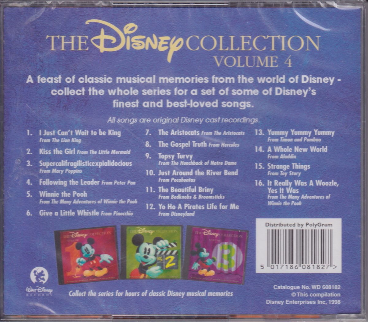 Format: CD Freetext: – Type: Compilation Number in Set: 1 Case Type: Standard jewel case Label & Cat.no.: Walt Disney Records – WD 608182 Series: The Disney Collection (2) – Volume 4 |