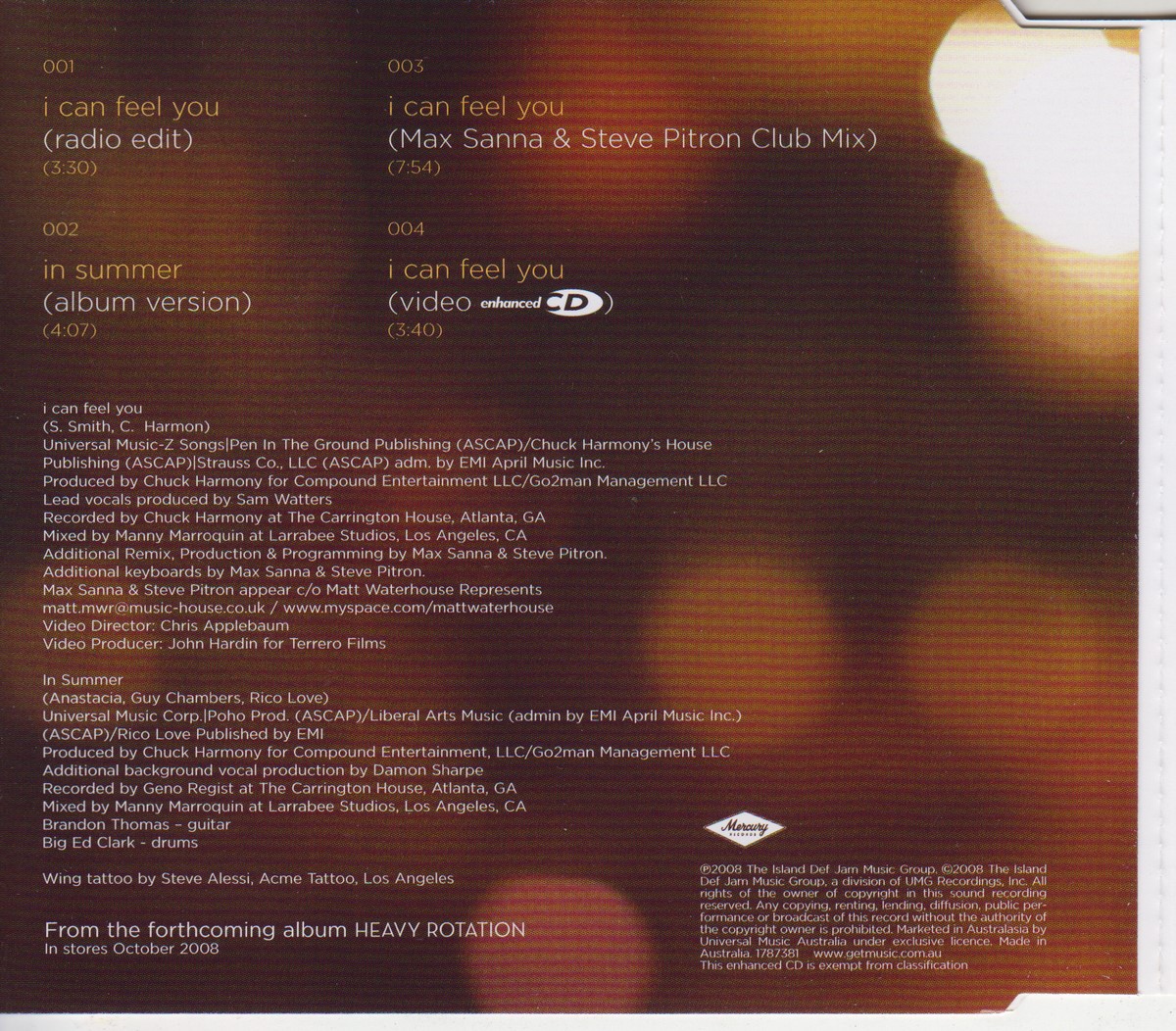 Country of release: Australasia Release Year: 2008 Edition: – Features: Enhanced CD, Import (non‑UK release) Notes: – Tracklist: 1 I Can Feel You (Radio Edit) 3:30 2 I Can Feel You (Max Sanna & Steve Pitron Club Mix) 7:54 • Remix – Max Sanna, Steve Pitron 3 In Summer (Album Version) 4:07 Video I Can Feel You More pictures, click to view full size: