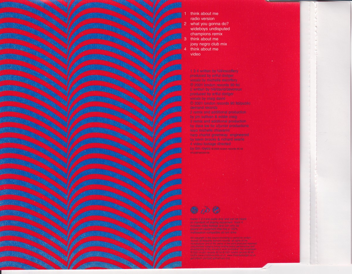 Country of release: UK Release Year: 2001 Edition: – Features: Enhanced CD Notes: – Tracklist: 1 Think About Me (Radio Version) 3:49 2 What You Gonna Do? (Wideboys Undisputed Champions Remix Edit) 3:47 • Remix – Wideboys[The Wideboys] 3 Think About Me (Joey Negro Club Mix) 7:59 • Remix – Joey Negro Video Think About Me 3:47 More pictures, click to view full size: