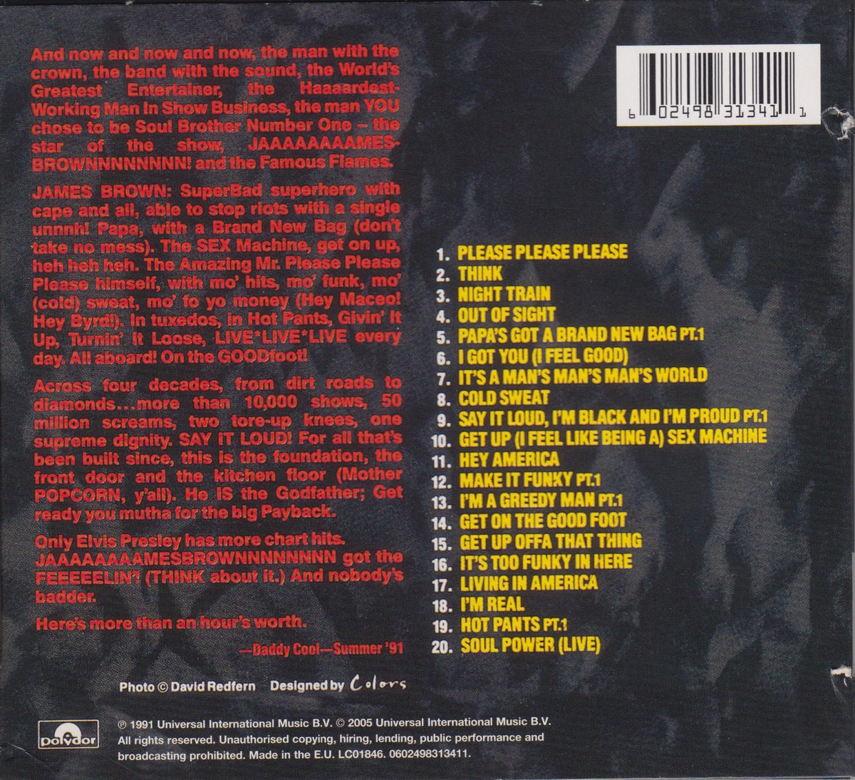 Country of release: Europe Release Year: 2005 Edition: – Features: Compilation Notes: – Tracklist: 1 Please Please Please 2:45 2 Think 2:46 3 Night Train 3:32 4 Out Of Sight 2:23 5 Papa's Got A Brand New Bag Pt.1 2:07 6 I Got You (I Feel Good) 2:47 7 It's A Man's Man's Man's World 2:48 8 Cold Sweat 2:52 9 Say It Loud, I'm Black And I'm Proud Pt.1 2:47 10 Get Up (I Feel Like Being A) Sex Machine 5:16 11 Hey America 3:38 12 Make It Funky Pt.1 3:16 13 I'm A Greedy Man Pt.1 3:37 14 Get On The Good Foot 3:35 15 Get Up Offa That Thing 4:10 16 It's Too Funky In Here 3:59 17 Living In America 4:42 18 I'm Real 5:34 19 Hot Pants Pt.1 3:08 20 Soul Power (Live) 4:20 More pictures, click to view full size: