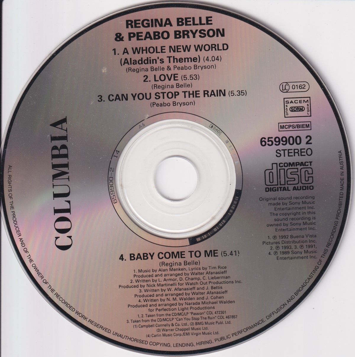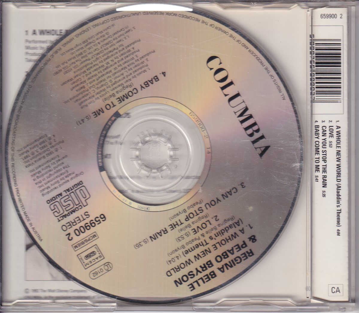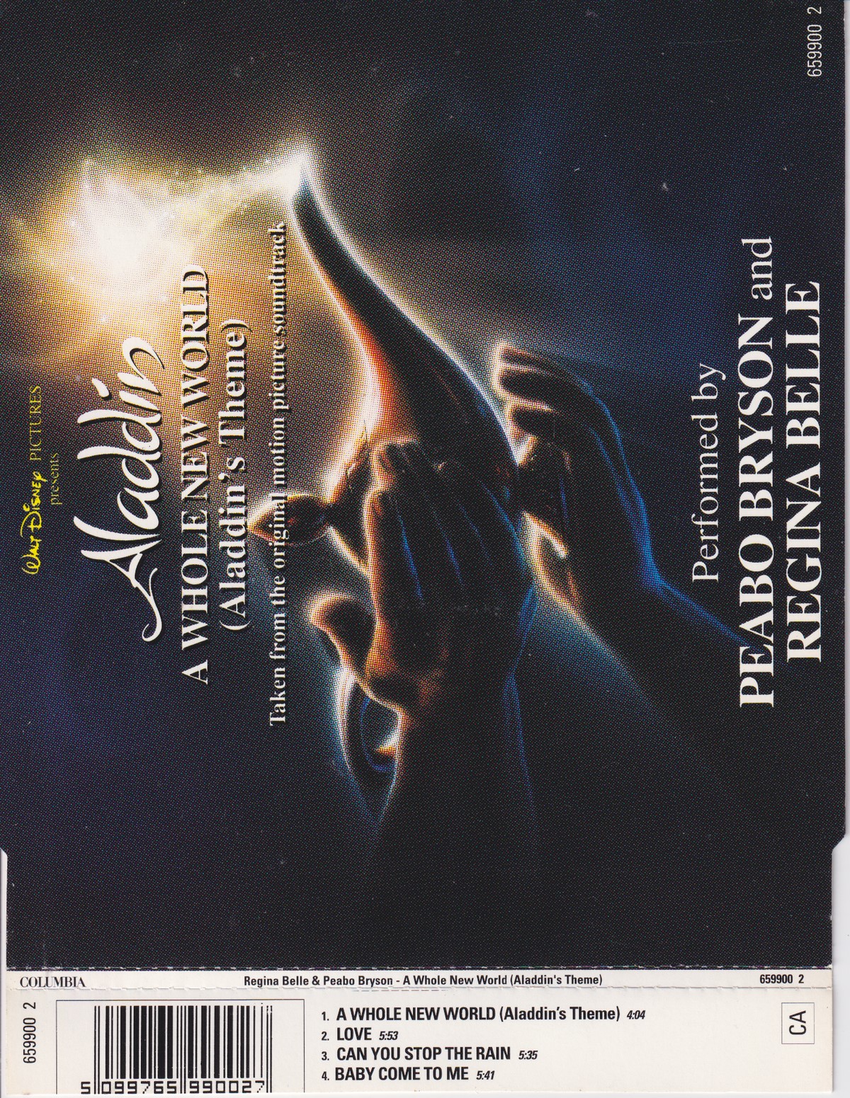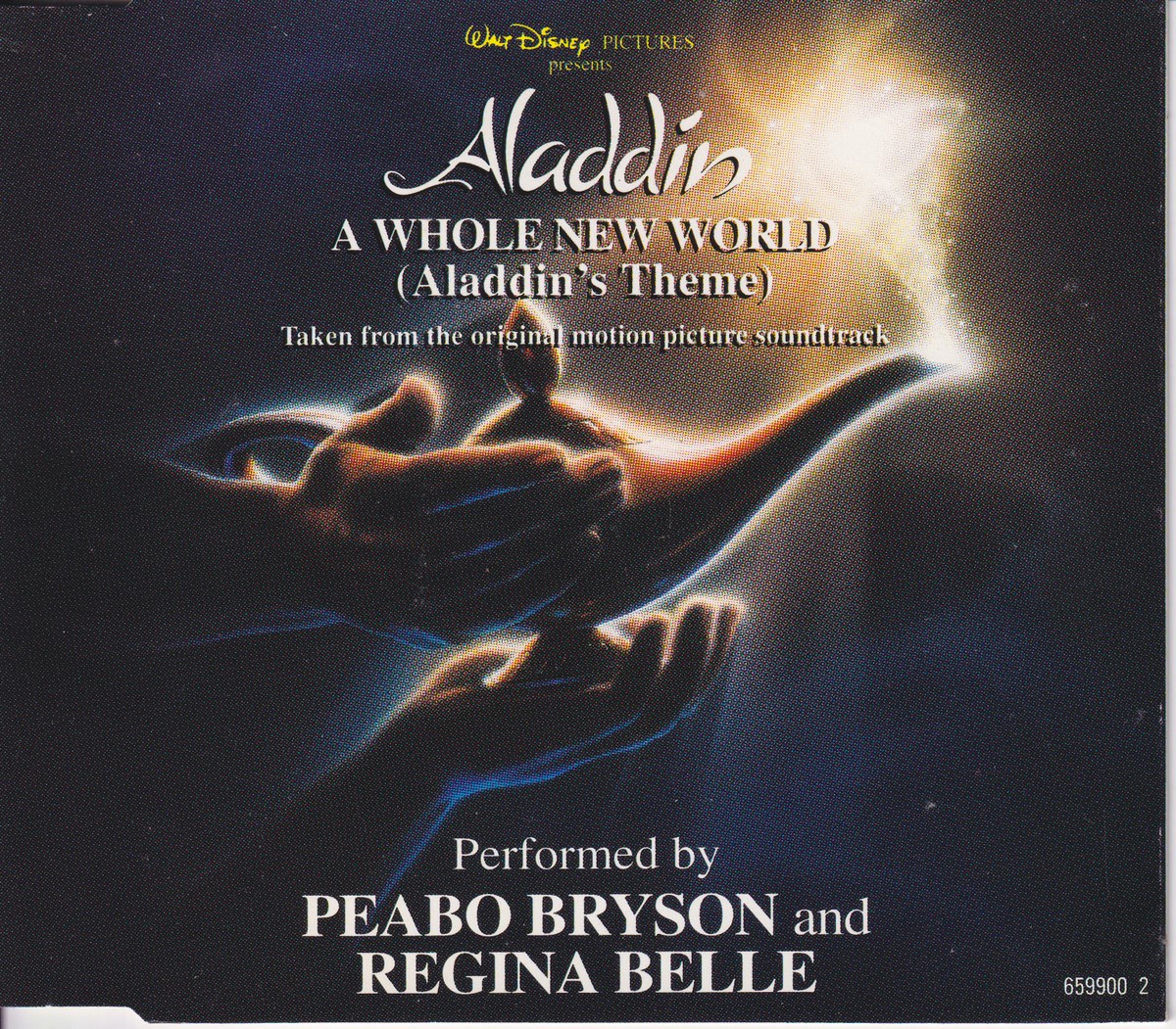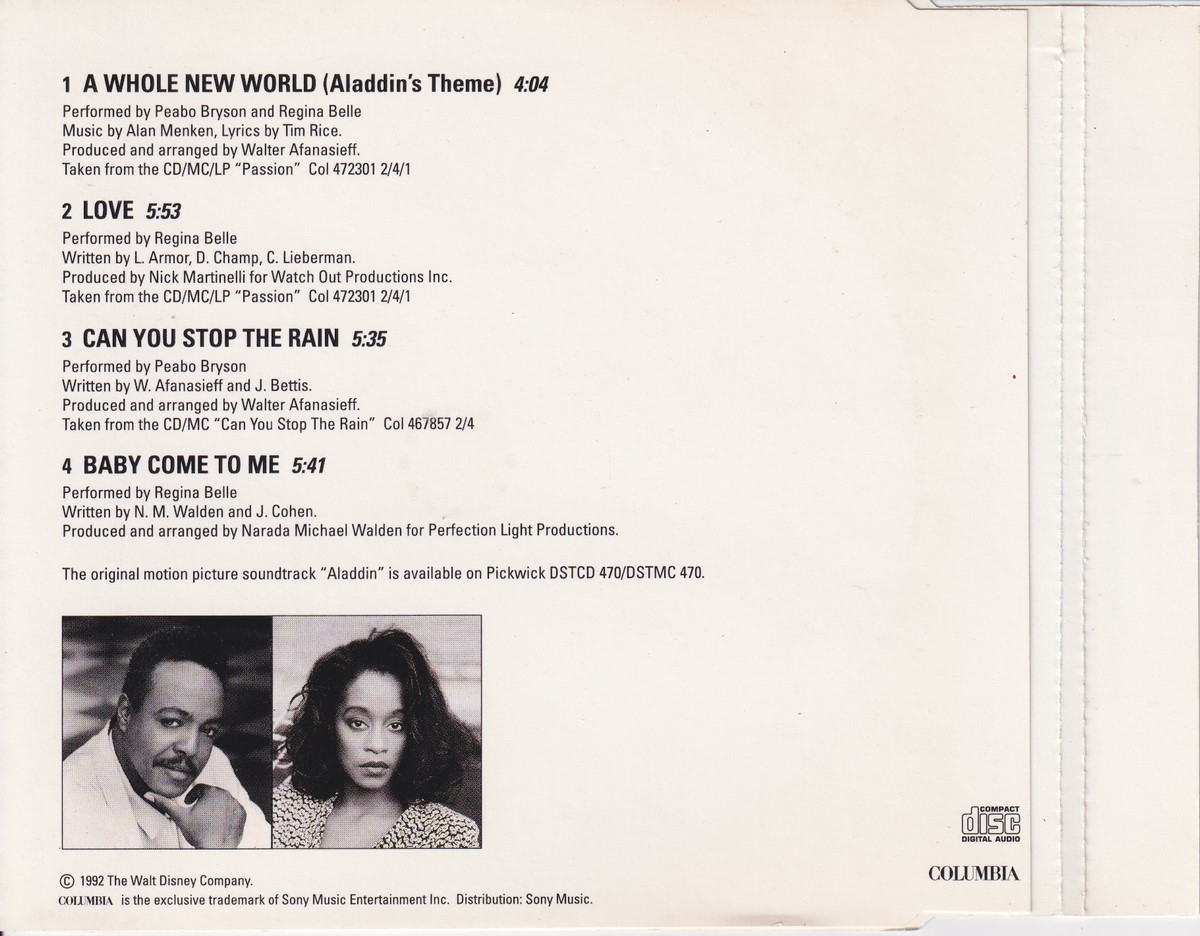 1: Media condition: Very Good (VG) Sleeve condition: Very Good Plus (VG+) Condition Notes: – eBay listing: Peabo Bryson and Regina Belle - A Whole New World (Aladdin's Theme) (1992) VG Condition: Very Good Price: £1.45 https://www.ebay.co.uk/itm/116691648654