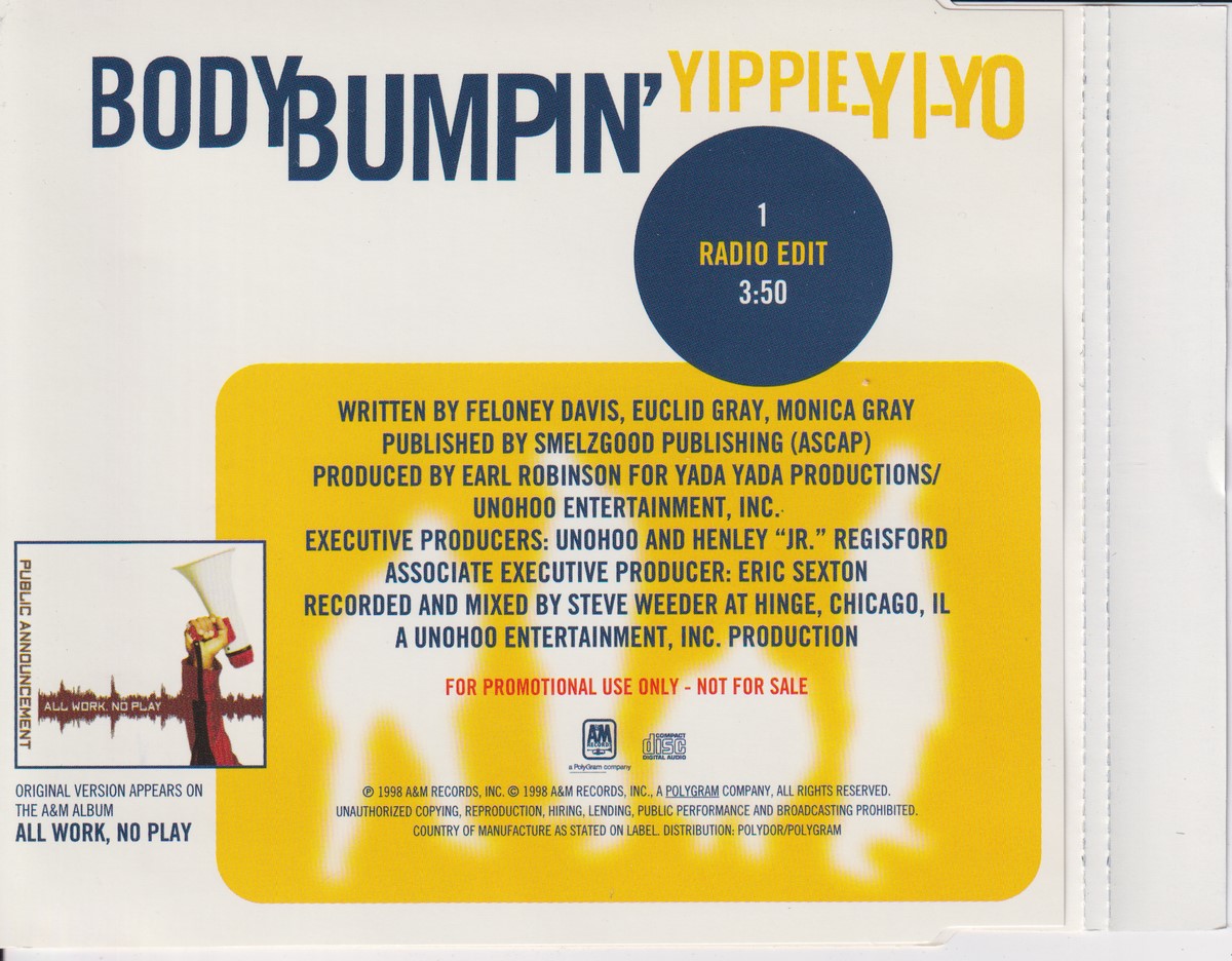 1: Media condition: Very Good (VG) Sleeve condition: Mint (M) Condition Notes: – eBay listing: Public Announcement - Body Bumpin' Yippie-Yi-Yo (1998,Promo) EX Condition: Very Good Price: £1.95 https://www.ebay.co.uk/itm/114017209388